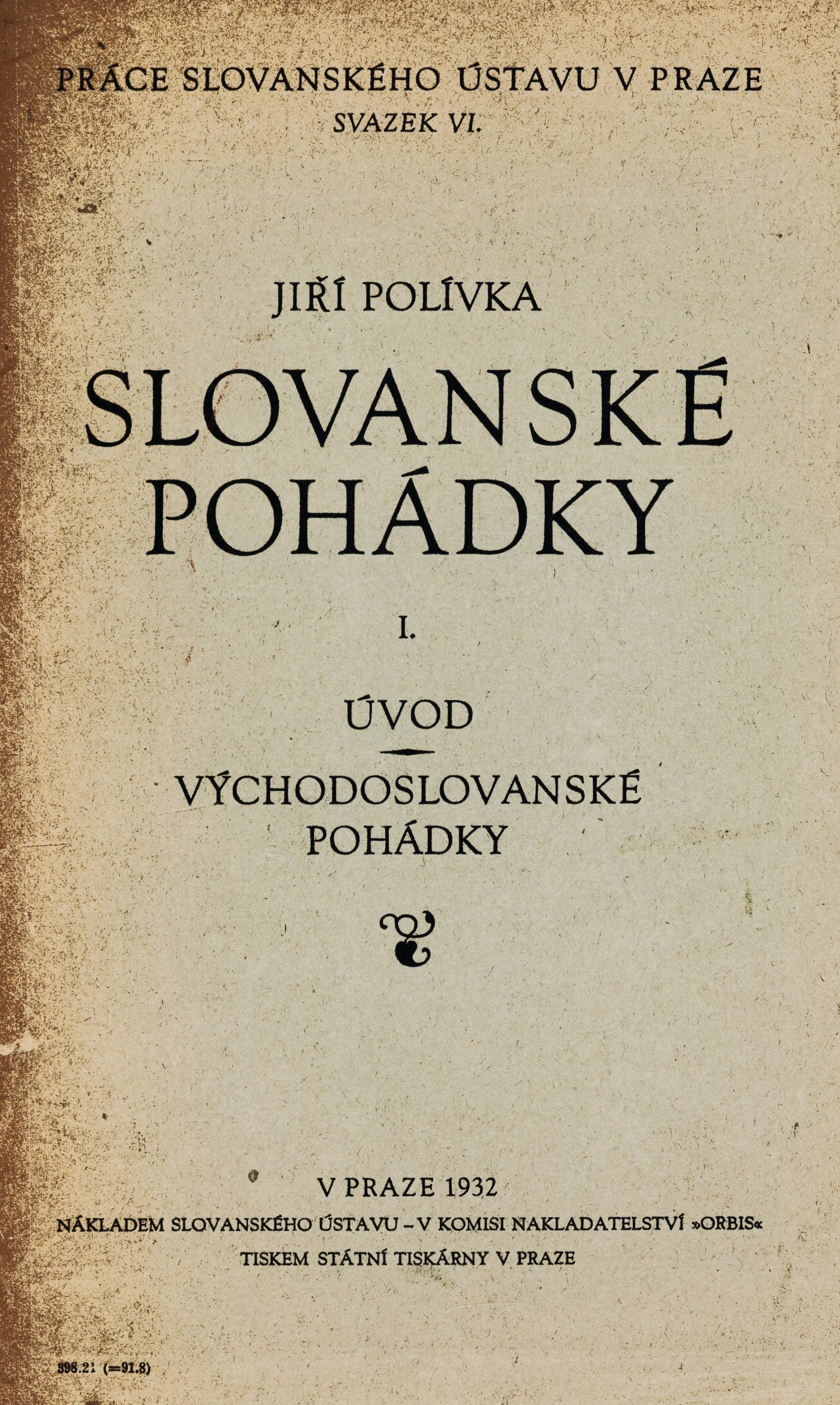 Title information Slovanské pohádky : Úvod. Východoslovanské pohádky. I / Jiří Polívka Personal name Polívka, Jiří, 1858-1933 (Author) Další autoři Slovanský ústav (Československá akademie věd) (Publisher) Orbis (nakladatelství a vydavatelství) (Publisher) Státní tiskárna v Praze (Printer) Publication V Praze : nákladem Slovanského ústavu, v komisi nakladatelství Orbis, 1932 Manufacture V Praze : tiskem Státní tiskárny Scope 255 stran ; 24 cm ISBN (brožováno) Edition Práce Slovanského ústavu v Praze Svazek VI