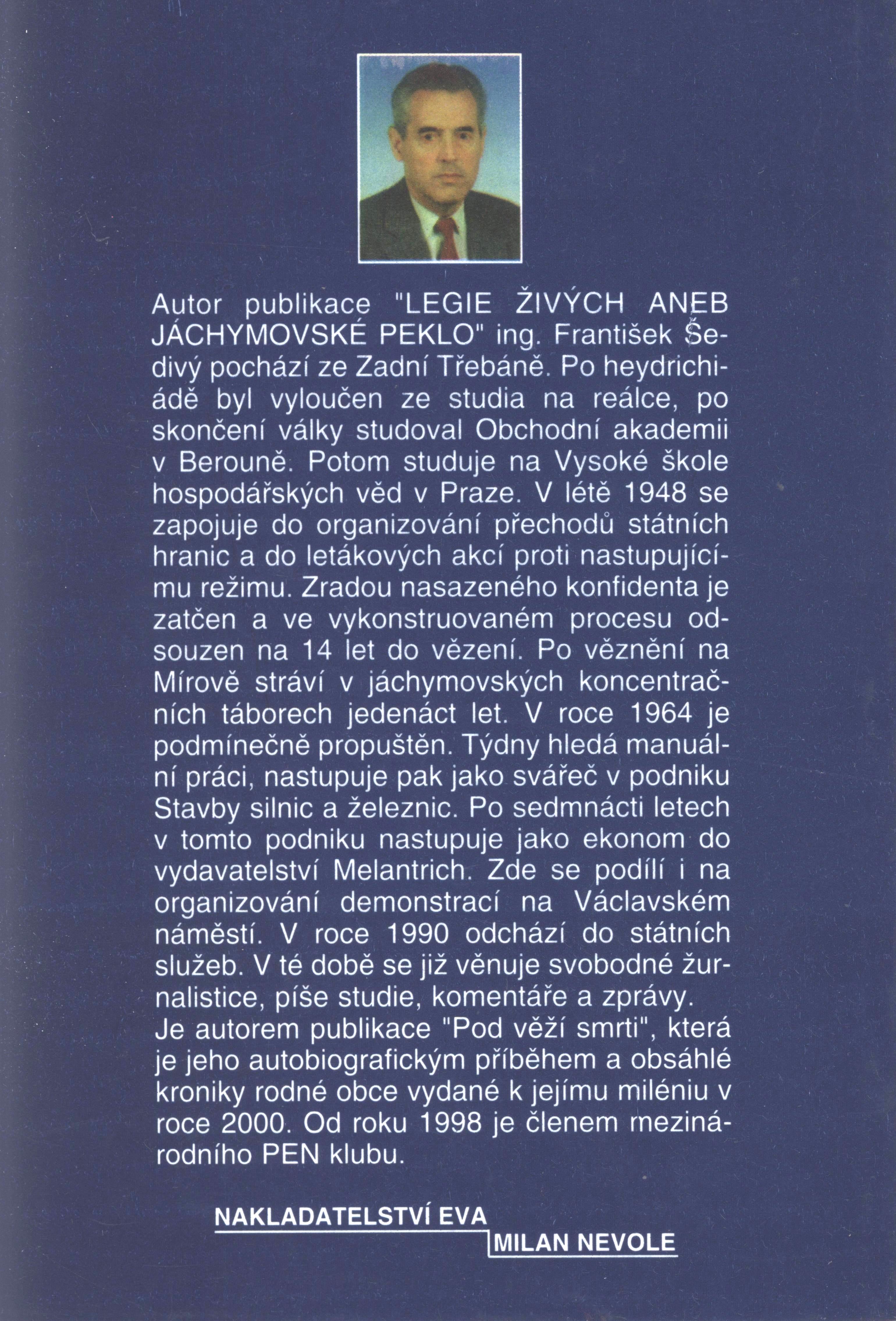 Title information Legie živých, aneb, Jáchymovské peklo / František Šedivý ; [grafická úprava a obálka Eva Gruberová] Personal name Šedivý, František, 1927- (Author) Další autoři Gruberová, Eva (Book designer) (Bookjacket designer) Edition statement 1. vyd. Publication Praha : Nakladatelství Eva - Milan Nevole, 2003 Scope 110 s., [24] s. obr. příl. : il. mapy ISBN brož. Country Czech Republic Language Czech Note Barevná obálka s barevnou reprodukovanou fotografií. - Na přední záložce anonce knihy, na zadní záložce inzerce knih z nakaladatelství. - Nakladatelská značka na vakátě. - Úvod. - Prameny. - Na zadní straně obálky barevná fotografie autora a jeho stručná biografie a bibliografie.