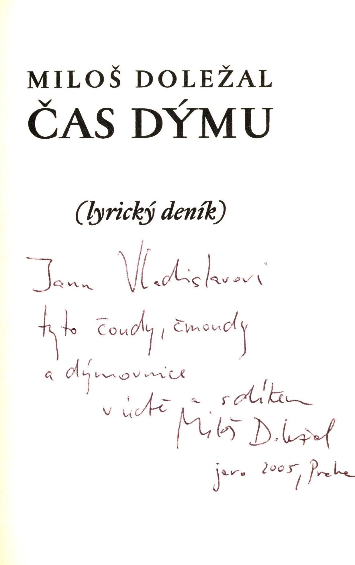 Sign. JVladislav 393 - Dedikace autora ''Janu Vladislavovi tyto čoudy, čmoudy a dýmovnice v úctě a s díky Miloš Doležal, jaro 2005, Praha''