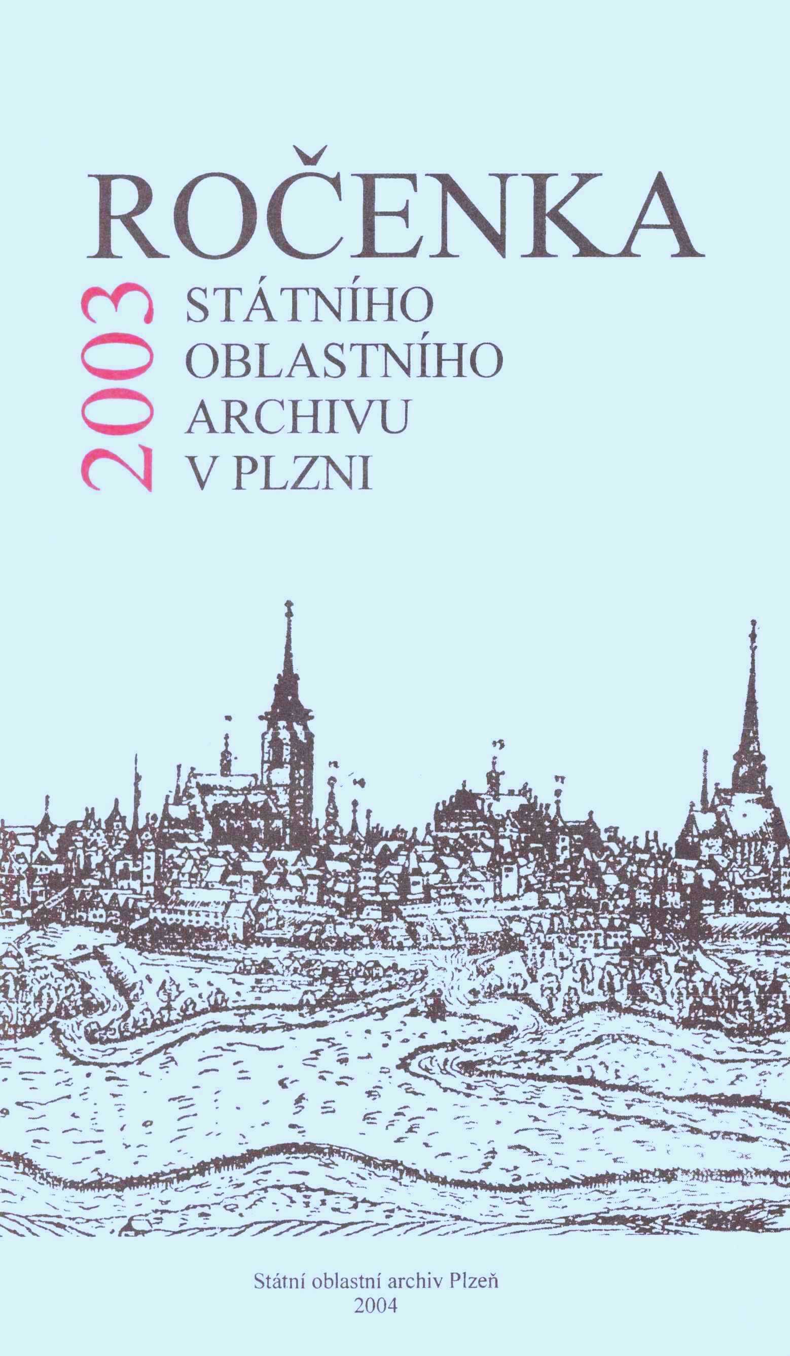 Ročenka Státního oblastního archivu v Plzni 2003 / [redakční rada Miroslav Eisenhammer ... et al.]. -- V Plzni : Státní oblastní archiv v Plzni, 2004. -- 147 s. : il., faksim. tb. -- Zdobená barevná obálka. - Čb. fotografie a faksimile. - Tabulky. - Obsahuje bibliografii. -- ISBN : 80-239-2960-7 (brož.).