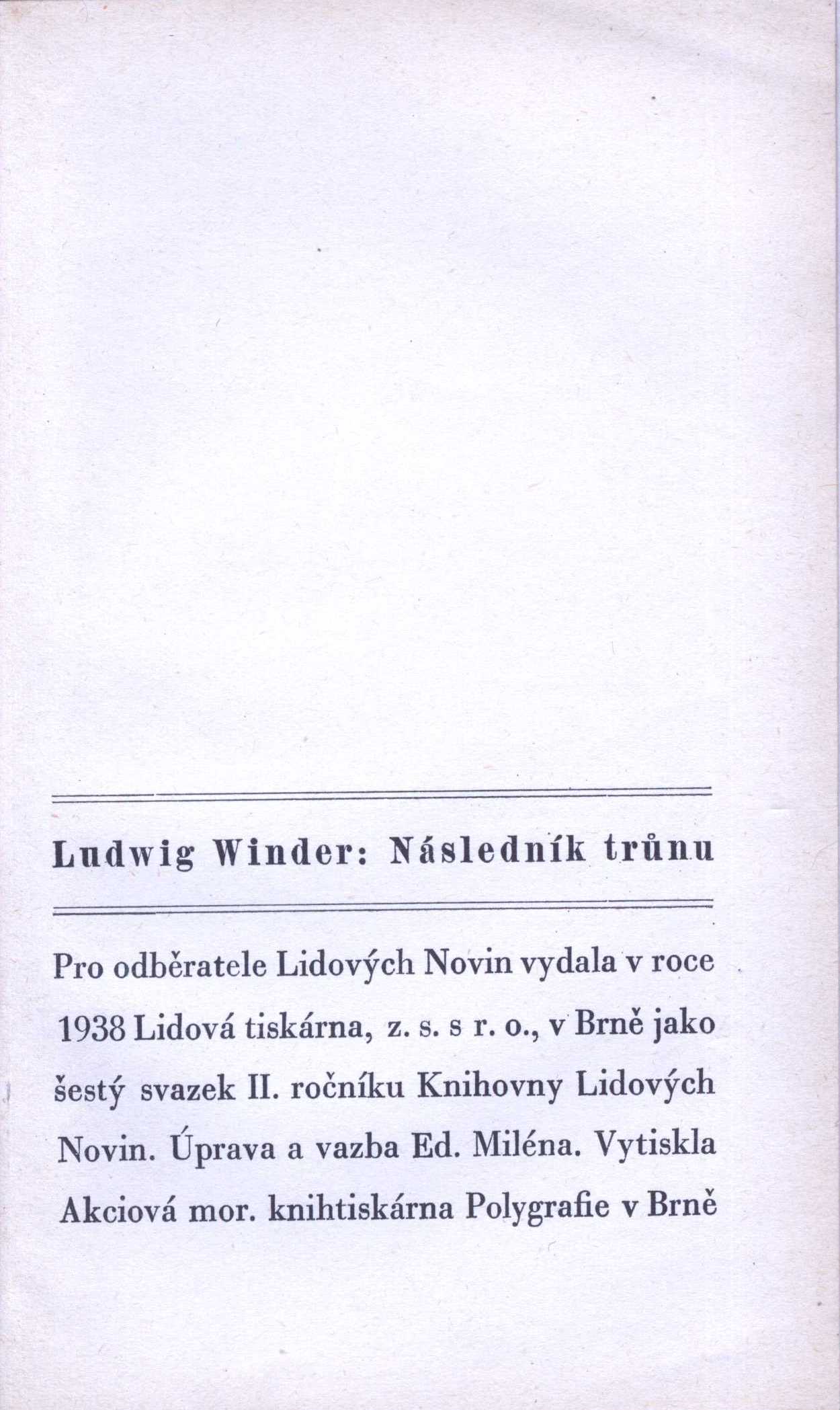 Title information Následník trůnu : román o Františku Ferdinandovi / Ludwig Winder ; [úprava a vazba Ed. Milén] Personal name Winder, Ludwig, 1889-1946 (Author) Další autoři Milén, Eduard, 1891-1976 (Book designer) (Binding designer) Corporation Lidové noviny (Brno) (Publisher) Akciová moravská knihtiskárna Polygrafie (Printer) Publication Brno : Lidové Noviny, 1938 Manufacture (Akciová mor. knihtiskárna Polygrafie) Scope 539 s. ; 8° ISBN (váz.) Edition Knihovna Lidových novin roč. II. sv. 6