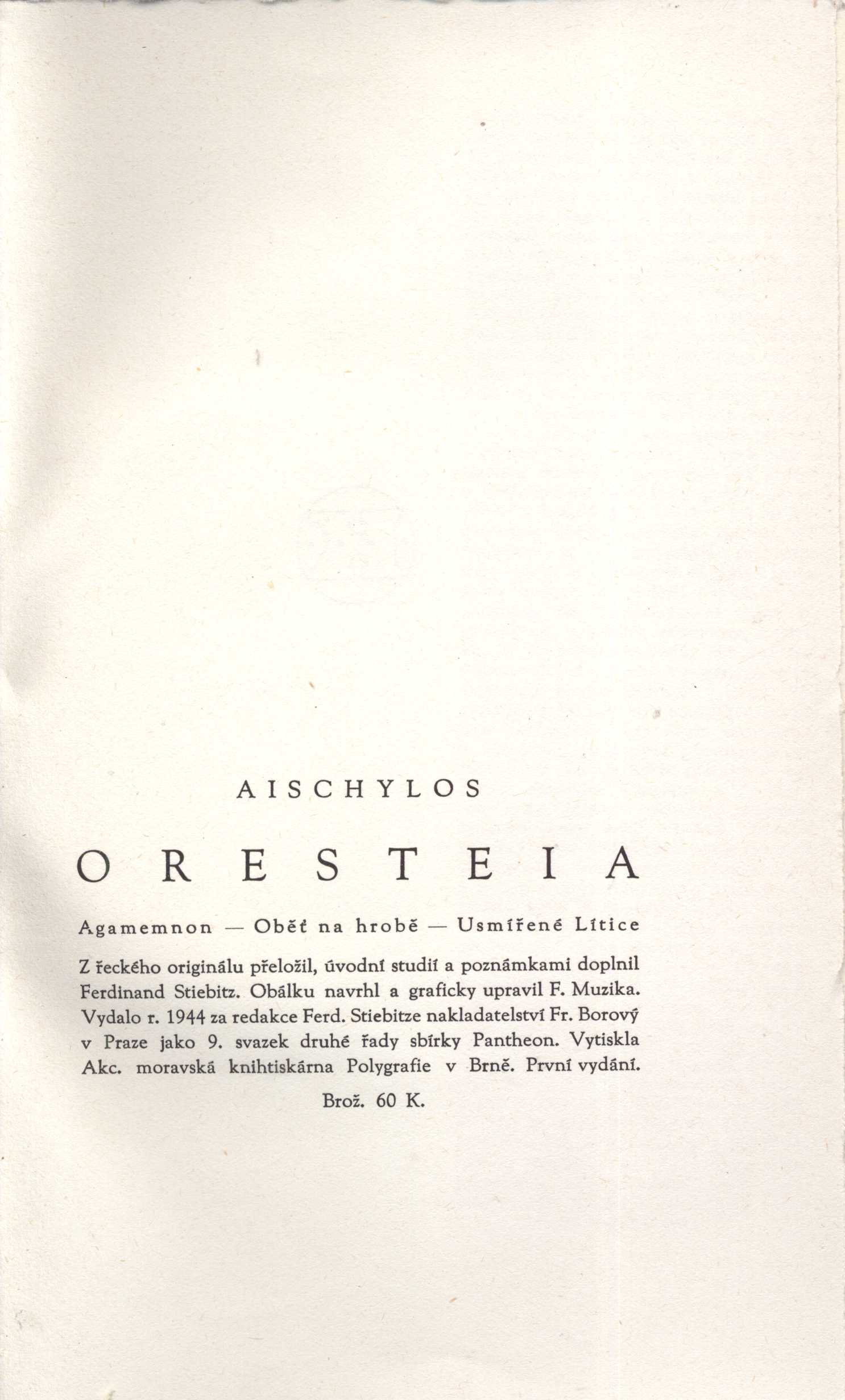 1. Title informationOresteia / Aischylos ; z řeckého originálu přeložil, úvodní studií a poznámkami doplnil Ferdinand Stiebitz ; obálku navrhl a graficky upravil František Muzika