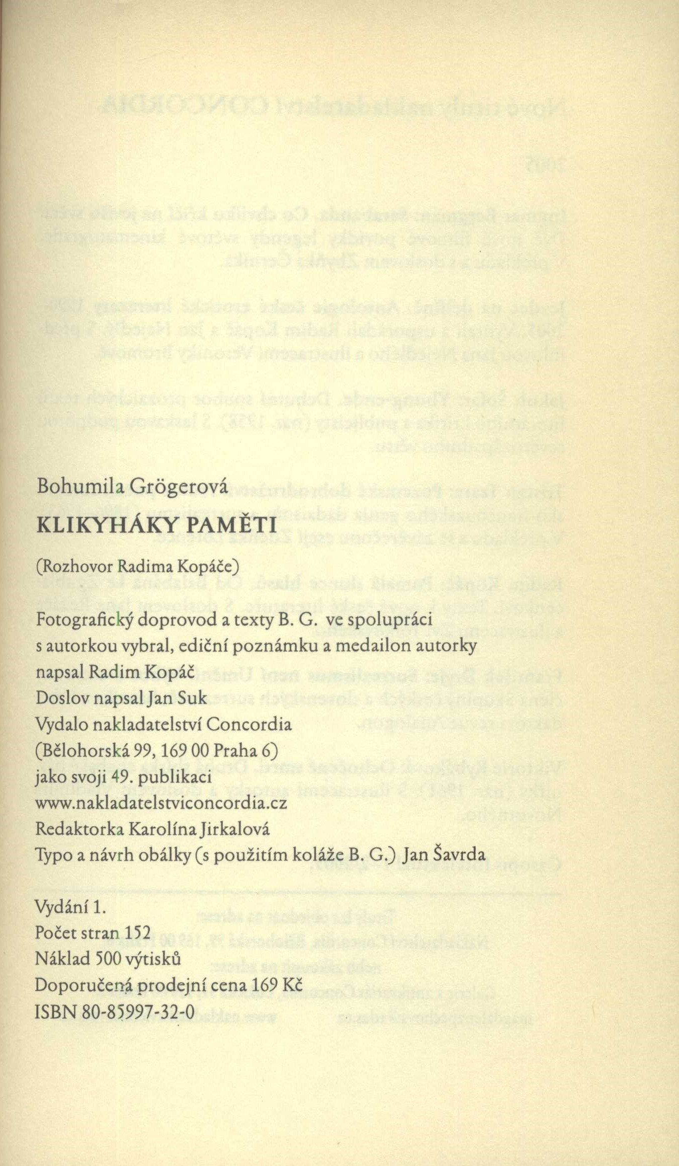 Grögerová, Bohumila, 1921-2014 - básnířka, překladatelka, publicistka * česká literatura * autobiografické vzpomínky * rozhovory * krátké prózy * české spisovatelky * Grögerová B. * r. 2005 821.162.3. 82-83. 82-32. 77. 821.162.3-055.2. 929Grögerová, B.. (0:82-83). 821.162.3-3