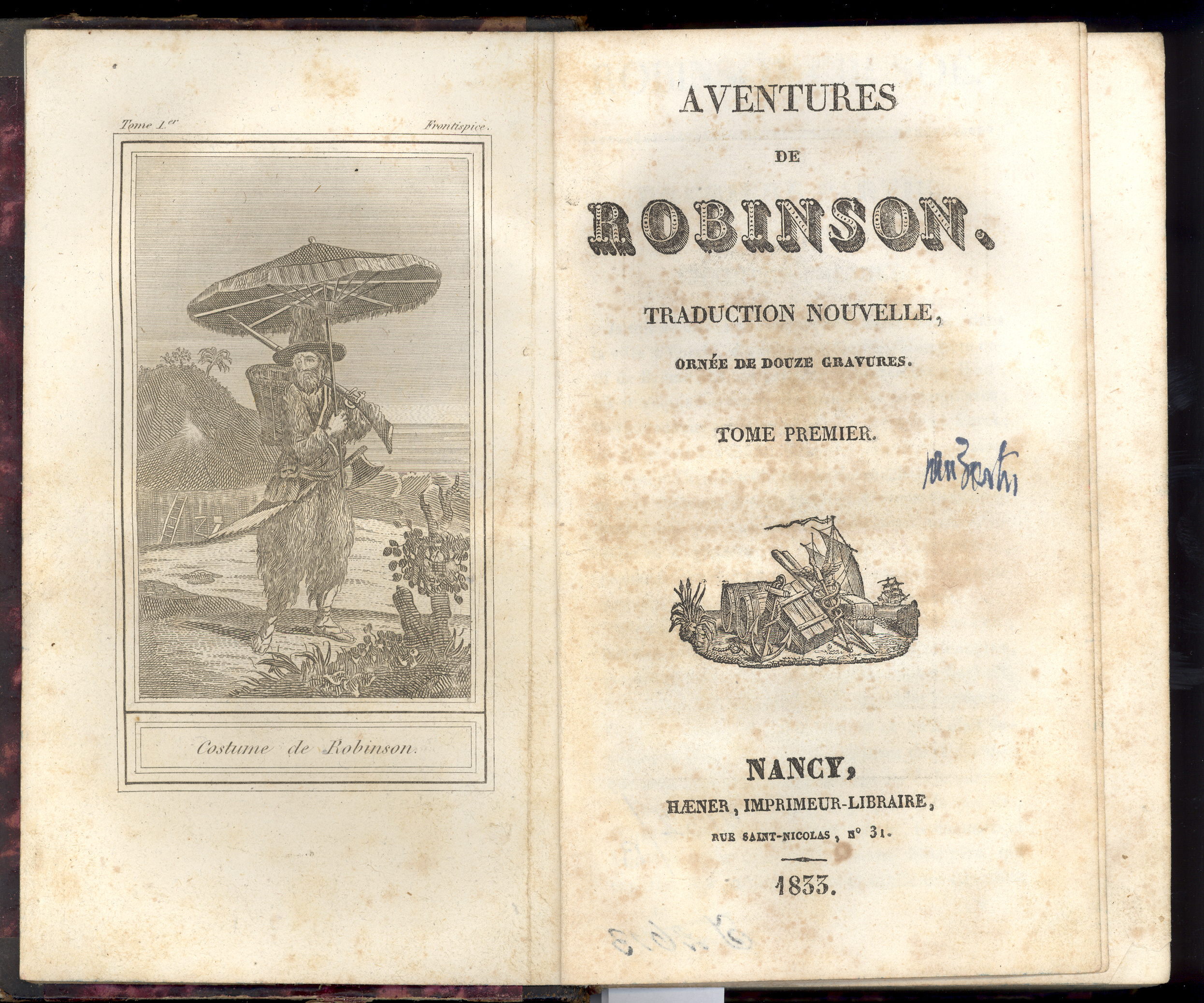 Title information Aventures de Robinson : traduction nouvelle, ornée de douze gravures / [Daniel Defoe]. Tome premier Personal name Defoe, Daniel, asi 1661-1731 (Author) Další var.názvy Aventures de Robinson Crusoé Publication Nancy : Haener, imprimeur-libraire, 1833 Scope [6], 356 s., [4] l. obr. příl. : il. ISBN (váz.) Country France Language French Language of the original English Note Frontisp. - Celostr. ilustrace.