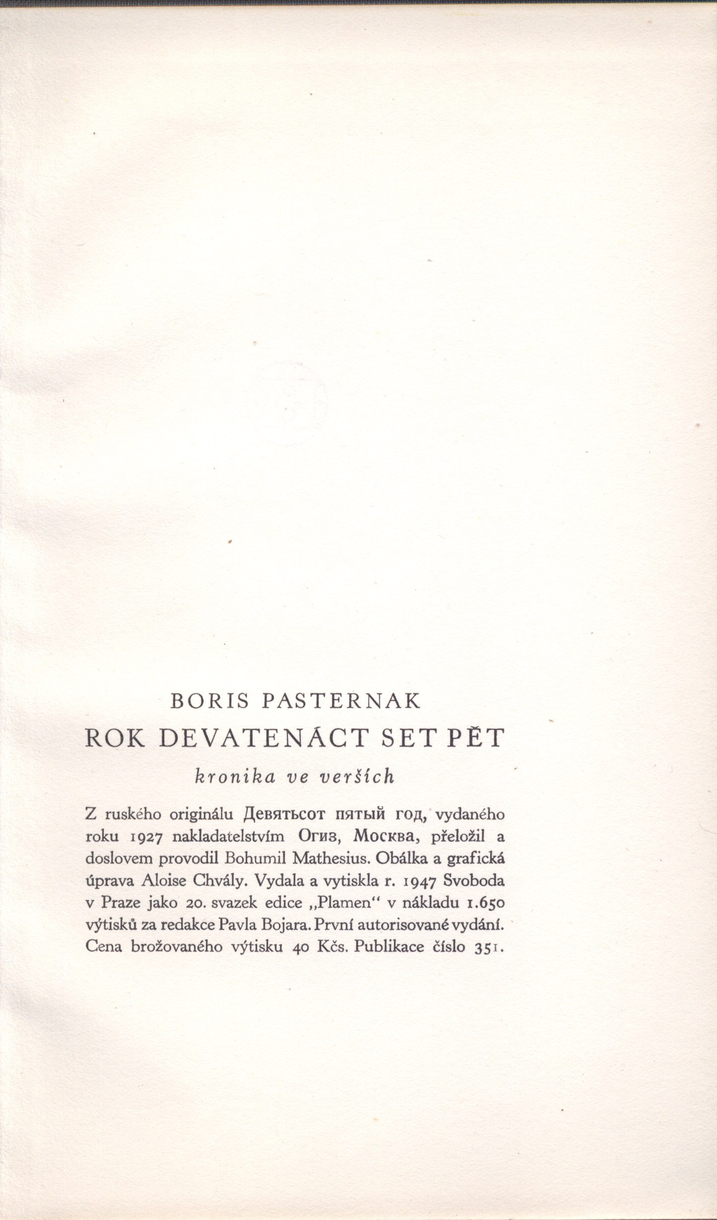 Plamen, (Svoboda)Country -cs Language Czech Language of the original Russian Note (Pře)vazba, bez obálky. - Nakladatelská značka. - Titulní list. - Doslov "Pasternak a revoluce z roku pátého" (B. Mathesius). - Tiráž s edicí. - Na rubu tiráže značka Kmene.