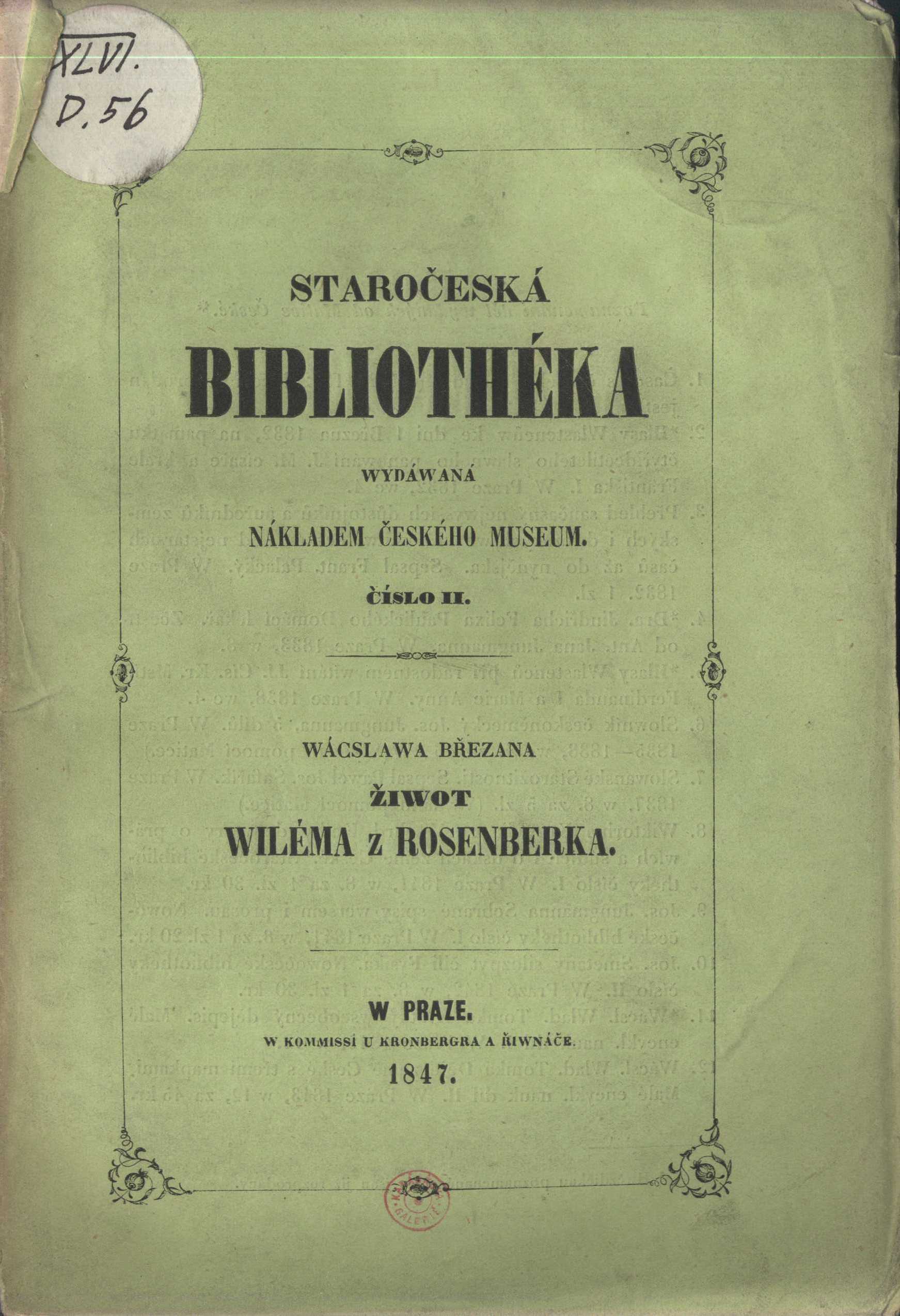 Staročeská biblioteka Spisy musejní (Kronberger a Řiwnáč)Country Czech Republic Language Czech Note Přední strana obálky zdobena rámcem. - Přesný rozsah: [8], 327, [1] s. - Nepodepsaná předmluva. - Jmenný - osobní i místní - rejstřík. - Chronologický přehled života Viléma z Rosenberka.