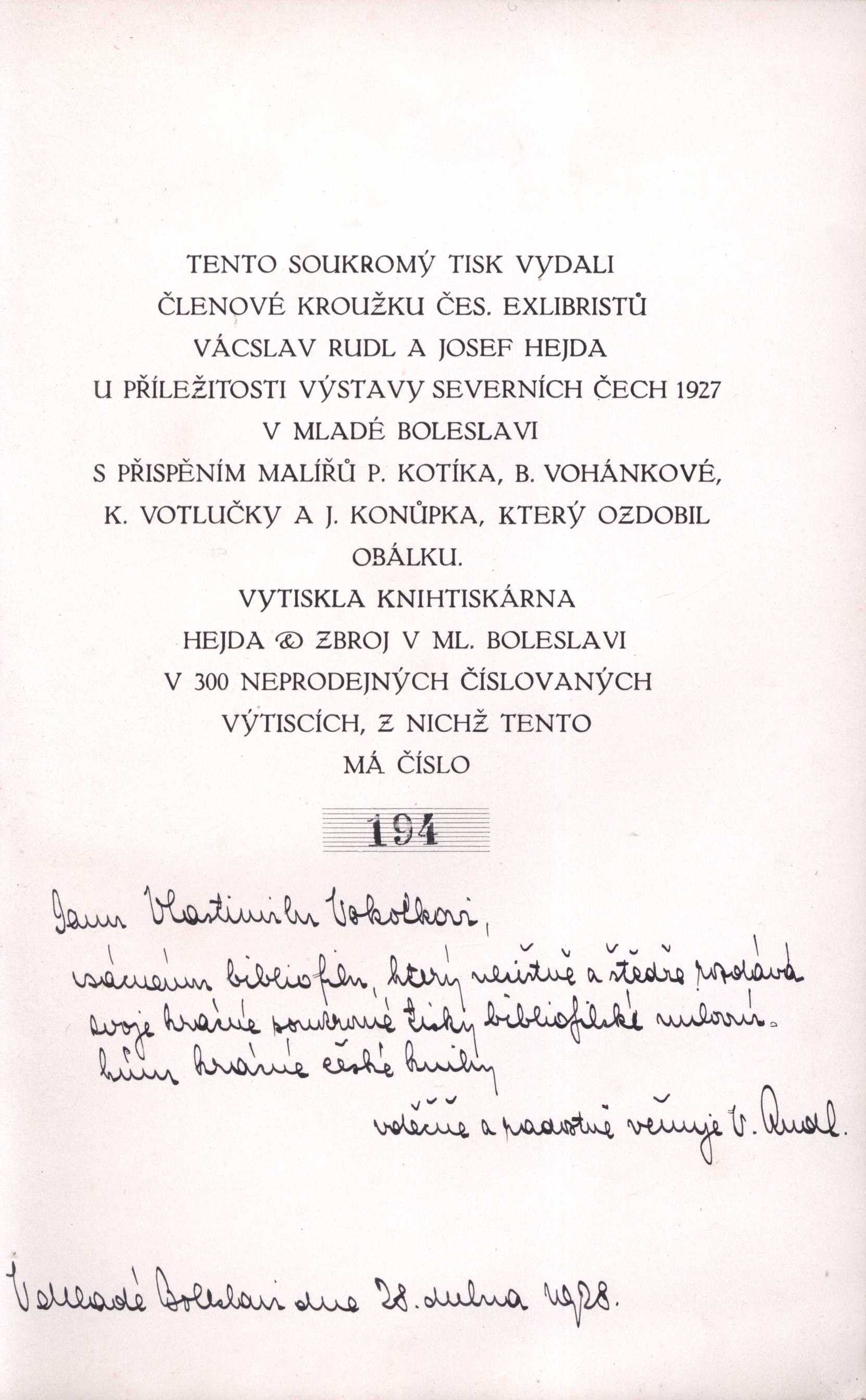 Sign. C12b 14362 - Knihovna Vlastimila Vokolka. - Tento výtisk má č. 194. - V tiráži věnování V. Rudla V. Vokolkovi.