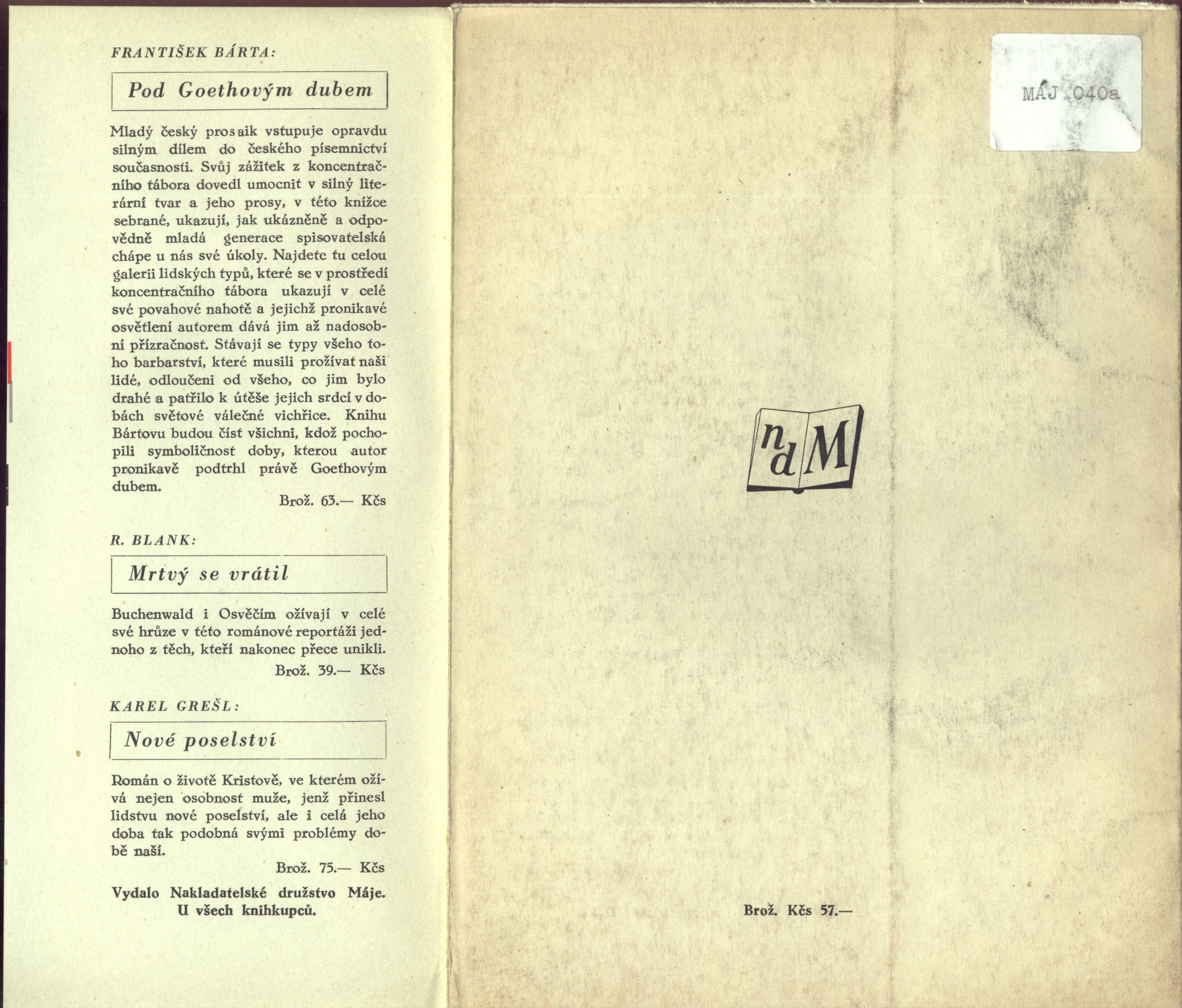 Uživatelské pole PNPU sign. Máj 040a (brožovaný výtisk) barevná, ilustrovaná obálka (M. Štěpánek). - Na přední záložce upoutávka na knihu. – Razítko Archiv Čs. spisovatel, č. P 457 u nakladatelské značky. - Patitul. – Dvoubarevný titulní list. – Obsah. - Tiráž s edicí. – Vakát. - Na zadní záložce nakladatelské upoutávky. - Na zadní straně obálky opakující se značka NDM a cena.