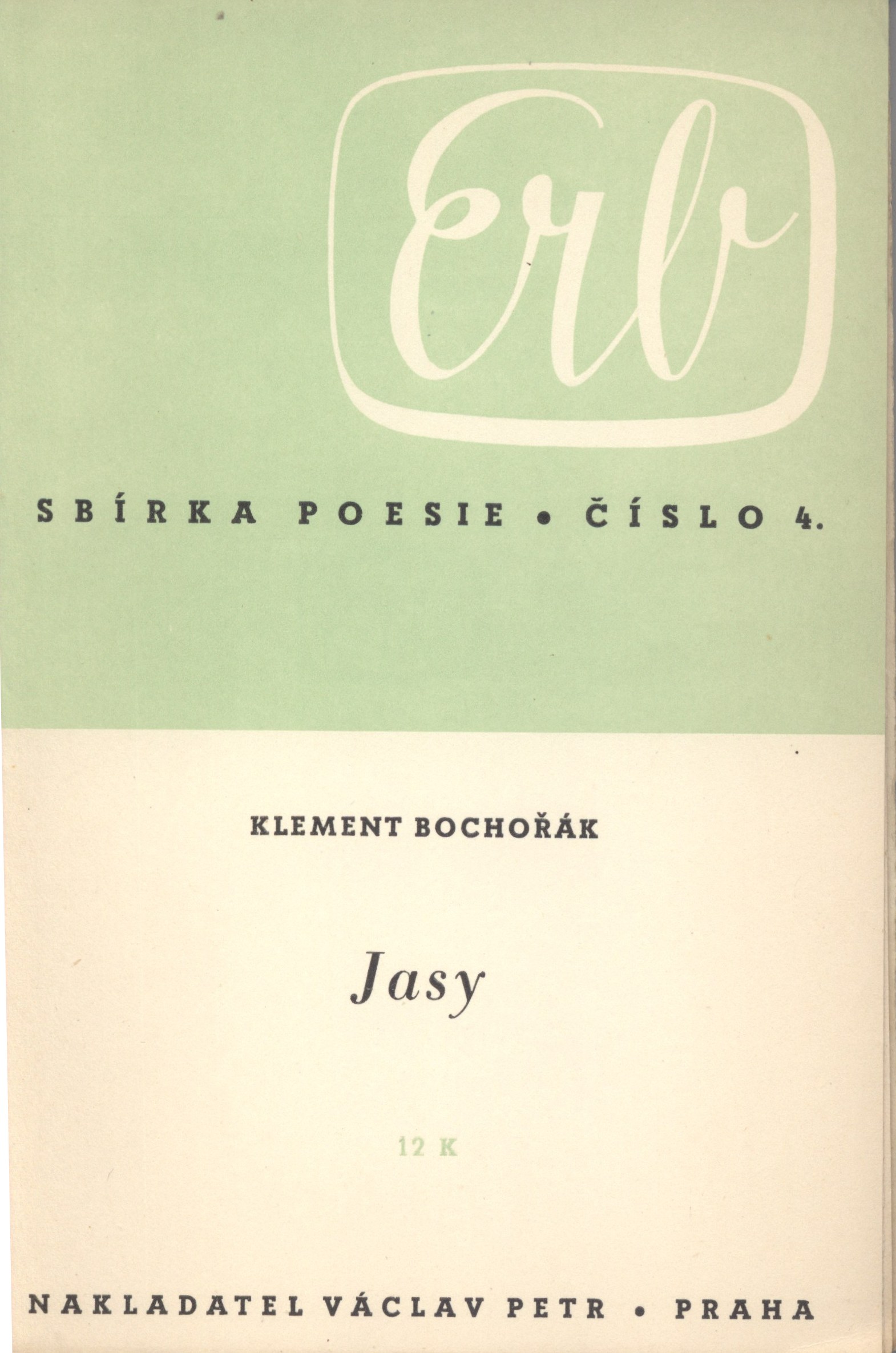 Title information Jasy : básně / Klement Bochořák ; [obálka a úprava Jaroslava Švába] Personal name Bochořák, Klement, 1910-1981 (Author) Další autoři Šváb, Jaroslav, 1906-1999 (Bookjacket designer) (Book designer) Corporation Václav Petr (nakladatelství) (Publisher) Osvěta (tiskárna) (Printer) Publication Praha : Václav Petr, 1940 Manufacture vytiskla „Osvěta“, společnost s o. r.) Scope 47 s. ; 21 cm ISBN brož. Edition Erb : sbírka poesie ; svazek 4