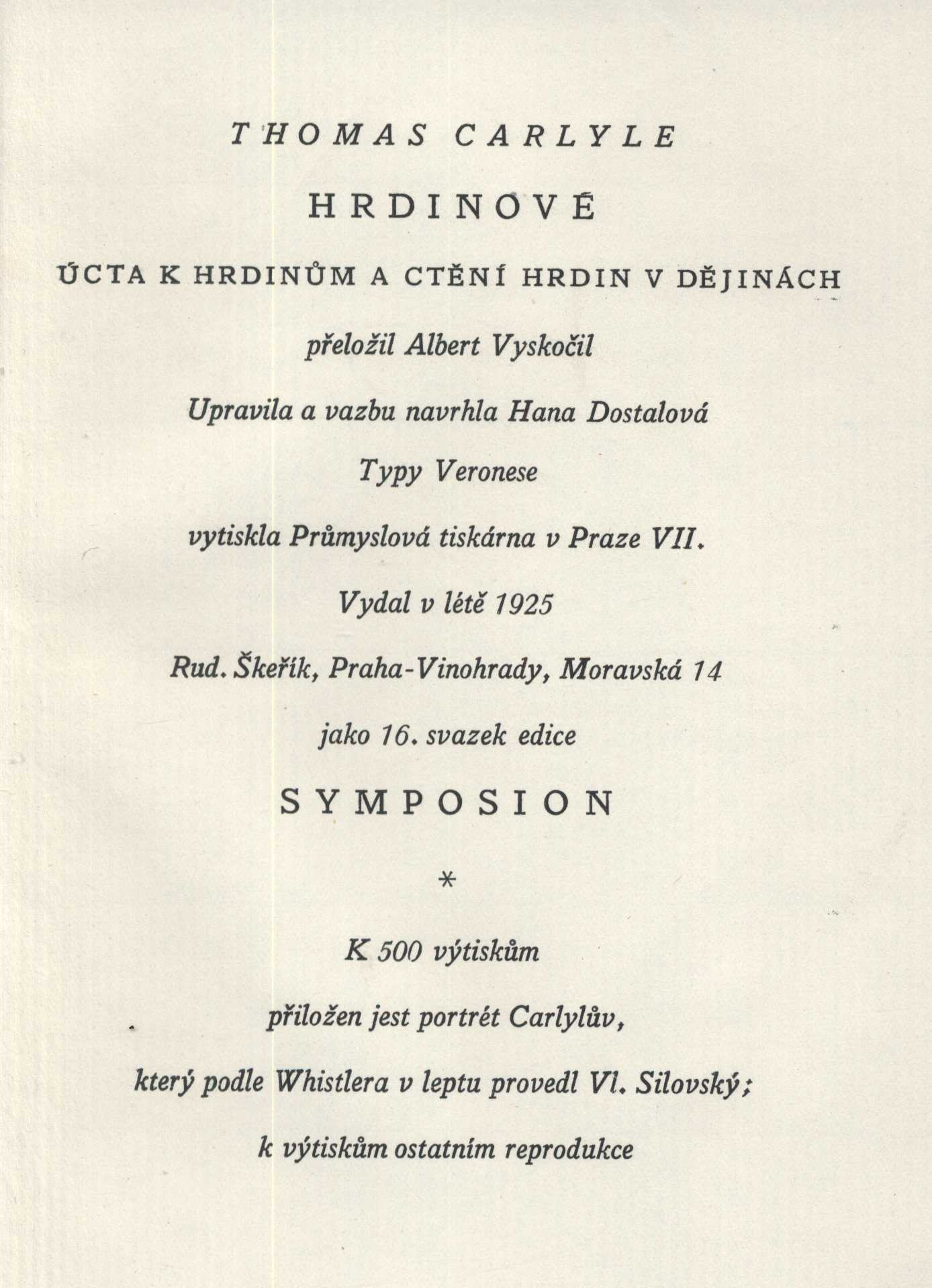 Symposion, (Rudolf Škeřík)Country Czech Republic Language Czech Language of the original English Note Typograficky řešená obálka. - Nakladatelský signet. - Červený a černý tisk knihy. - Úprava knihy: Hana Dostalová. - Sazba písmem Veronese. - Jeden list obrazové přílohy jako frontispis (portrét autora): u přednostních výtisků "portrét Carlylův, který podle Whistlera v leptu provedl Vl. Silovský; k výtiskům ostatním reprodukce".