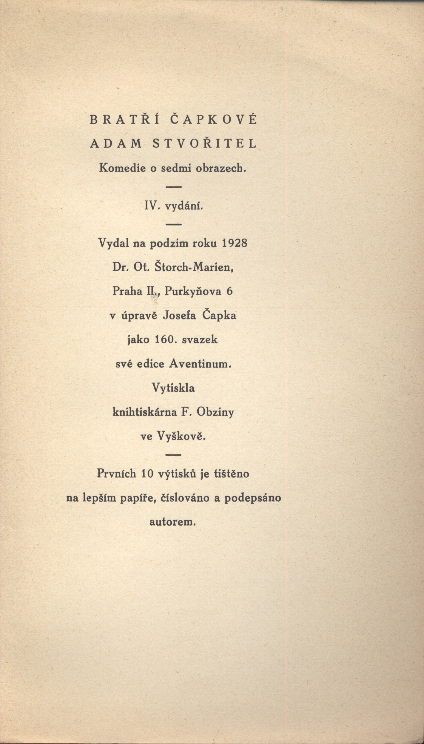Title information Adam stvořitel : komedie o sedmi obrazech / bratří Čapkové ; [v úpravě Josefa Čapka] Personal name Čapek, Josef, 1887-1945 (Author) (Book designer) Další autoři Čapek, Karel, 1890-1938 (Author) Corporation Dr. Ot. Štorch-Marien (nakladatelství) (Publisher) Aventinum (nakladatelství) (Publisher) František Obzina (tiskárna, nakladatelství) (Printer) Další var.názvy Komedie o sedmi obrazech Edition statement IV. vydání Publication Praha : Aventinum, Dr. Ot. Štorch-Marien, 1928 Manufacture F. Obzina) Scope 92 s. : il. ; 22 cm Edition Aventinum 160. svazek