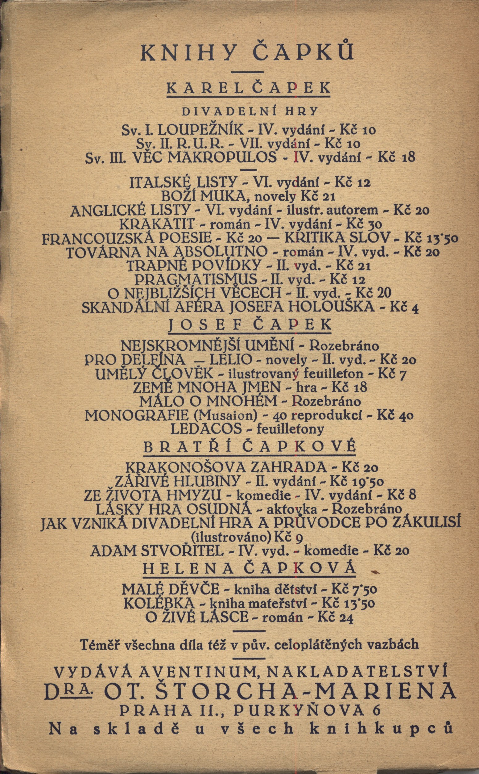 Aventinum (Dr. Ot. Štorch-Marien)Country Czech Republic Language Czech Note Zdobená obálka. - Dvoubarevný titulní list. - Tiráž s edicí. - Na zadní straně obálky upoutávky.