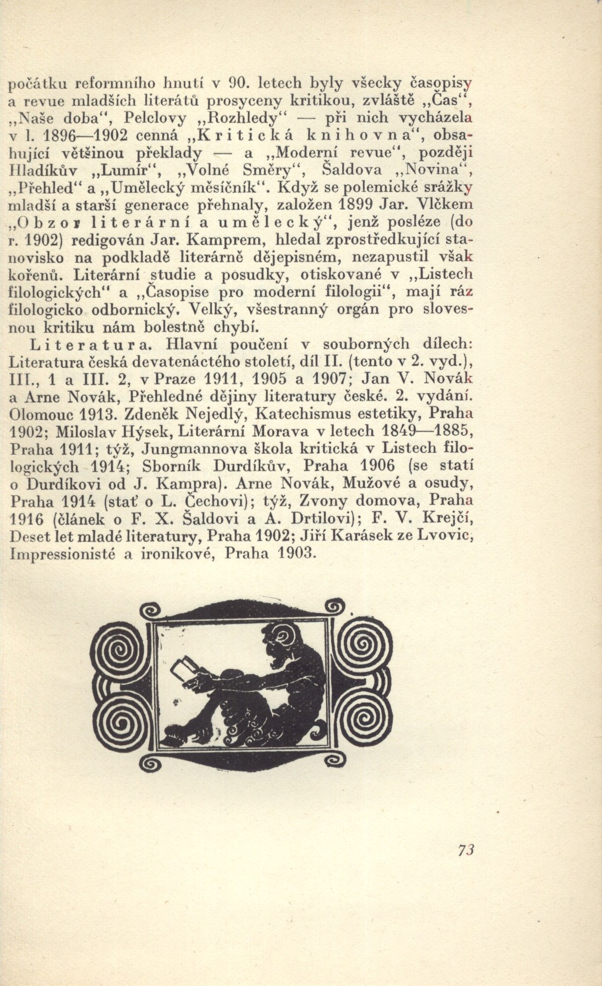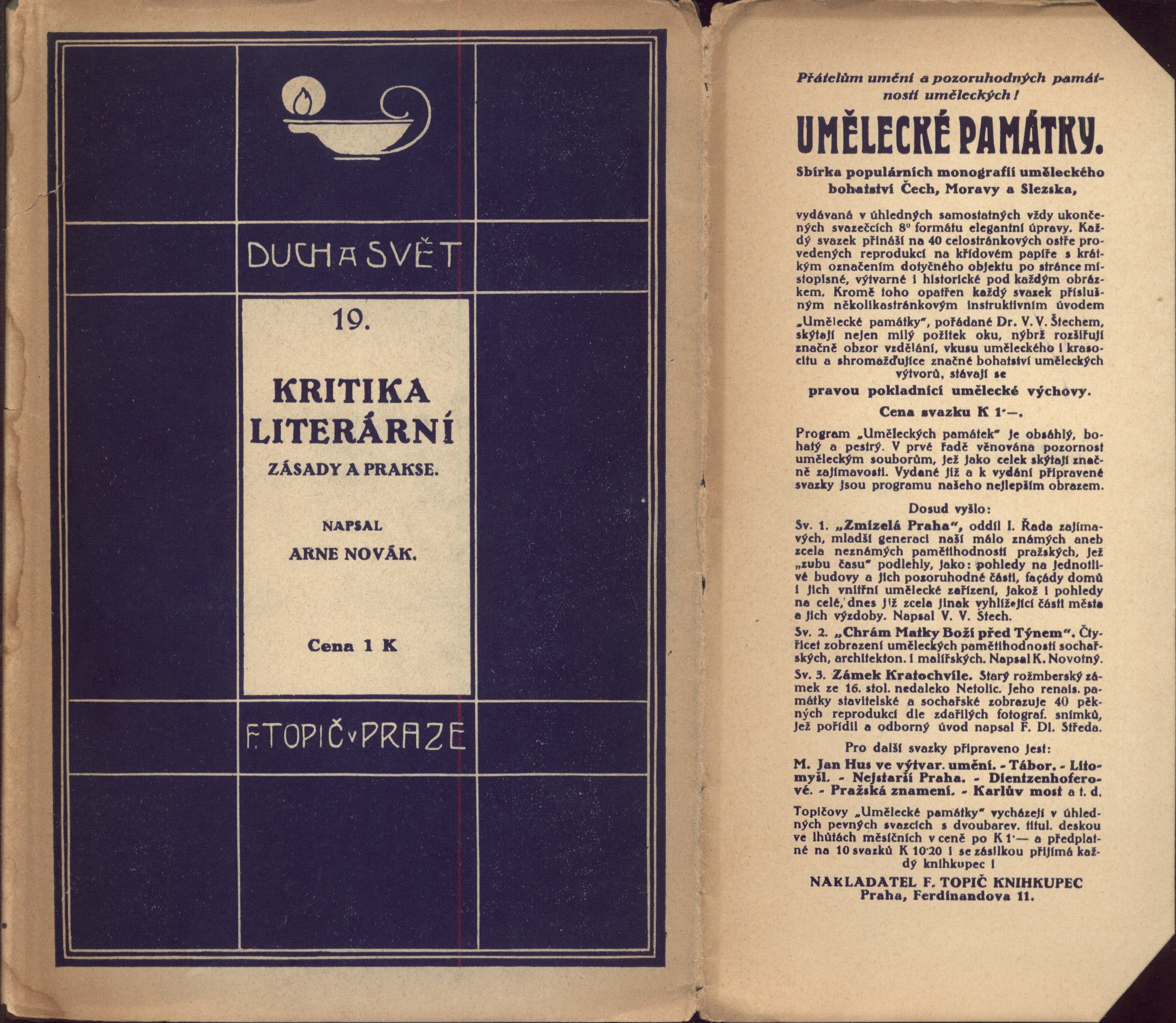 Kritika literární : zásady a prakse / napsal Arne Novák. -- Praha : F. Topič, 1916. -- (Unie). -- 73 s. : il. ; 19 cm. -- (Duch a svět : sbírka spisů populárně poučných : spisy populárně poučné / pořádá Jan Emler ; 19). -- Typizovaný přebal. - Na záložkách nakladatelské upoutávky. - Obálka brože. - Zdobená přídeští obálky. - Seznam edice. - Edice proti titulu, ve zdobných rámcích. - Tiskárna. - Zdobné záhlaví. - Koncové viněty. - Obsah. - Bez tiráže. - Ediční upoutávka. - Na zadní straně obálek opakující se nakladatelská značka a tiskárna; na obálce brože uveden rok vydání. -- Other title: Zásady a prakse. -- ISBN : brož.