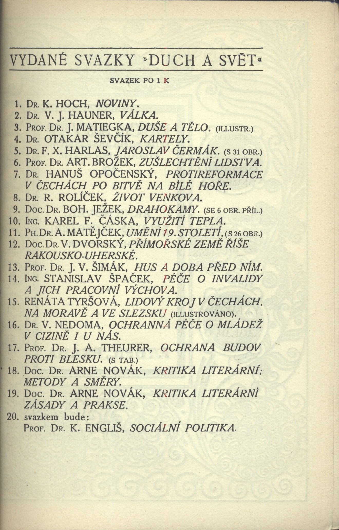 U sign. Topič 0377 (brožovaný výtisk) typizovaná obálka (přebal) s ediční značkou a nakladatelskými upoutávkami na záložce. - Typizovaná obálka brože na tužším kartonu s jinou ediční značkou. - Zdobená tištěná přídeští obálky a slepým ex libris. - Seznam edice. - Edice proti titulu, ve zdobných rámcích, typizované. - Tiskárna na rubu titulního listu. - Zdobné záhlaví. - Koncové viněty. - Obsah. - Bez tiráže. - 4 s. edičních upoutávek. - Na zadní straně obálek opakující se nakladatelská značka a tiskárna; na obálce brože uveden rok vydání.
