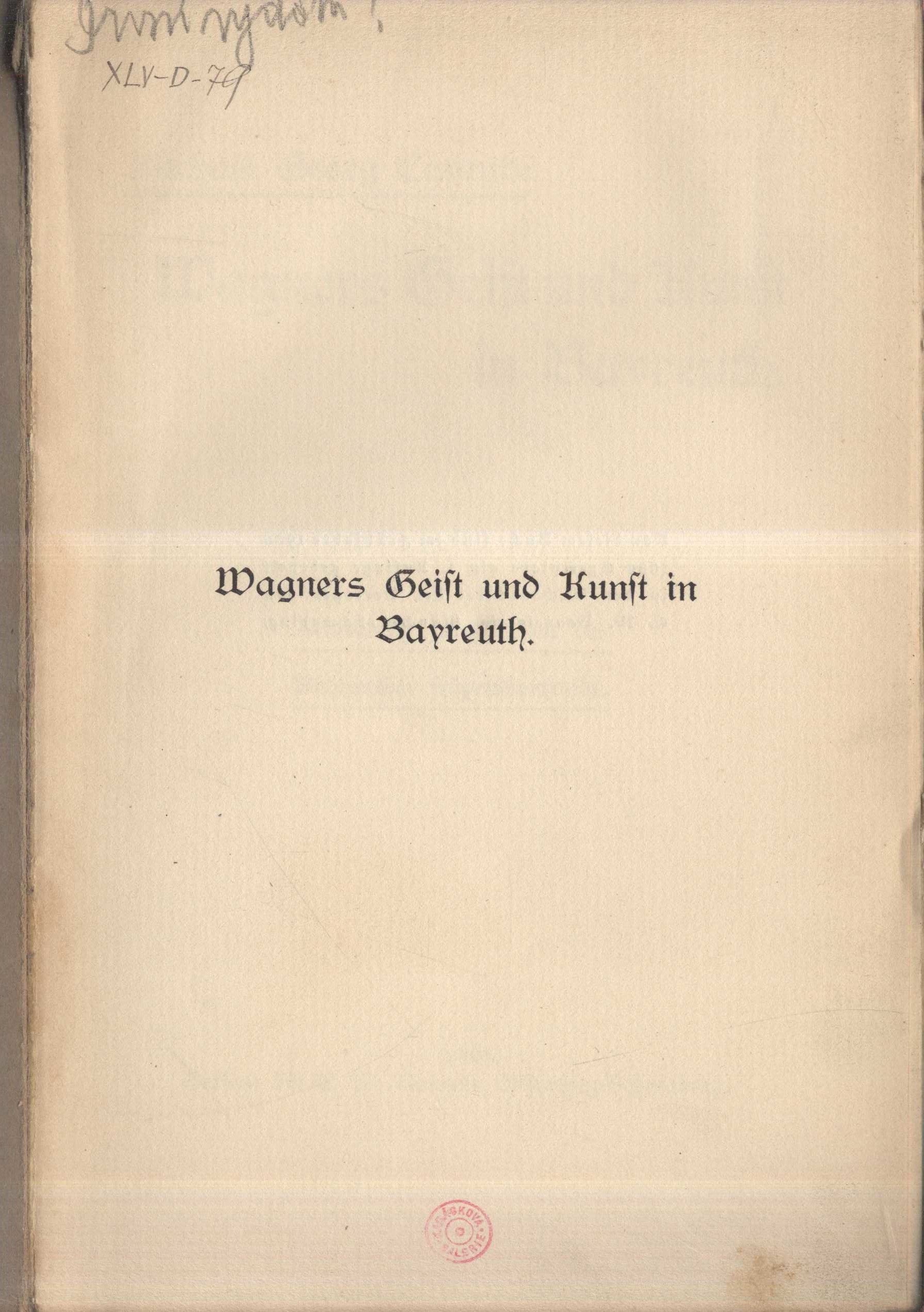 Title information Wagners Geist und Kunst in Bayreuth : Reinertrag zum Besten des Bayreuther Stipendienfonds / Michael Georg Conrad Personal name Conrad, Michael Georg, 1846-1927 (Author) Další autoři Karásek ze Lvovic, Jiří, 1871-1951 (Inscriber) Corporation E. W. Bonsels (nakladatelství) (Publisher) (Printer) Publication München-Schwabing : E. W. Bonsels, 1906 Scope 99 s. ISBN brož. Country Germany Language German Note Typograficky řešená obálka. - Sazba gotikou. - Náklad 1000 výtisků.