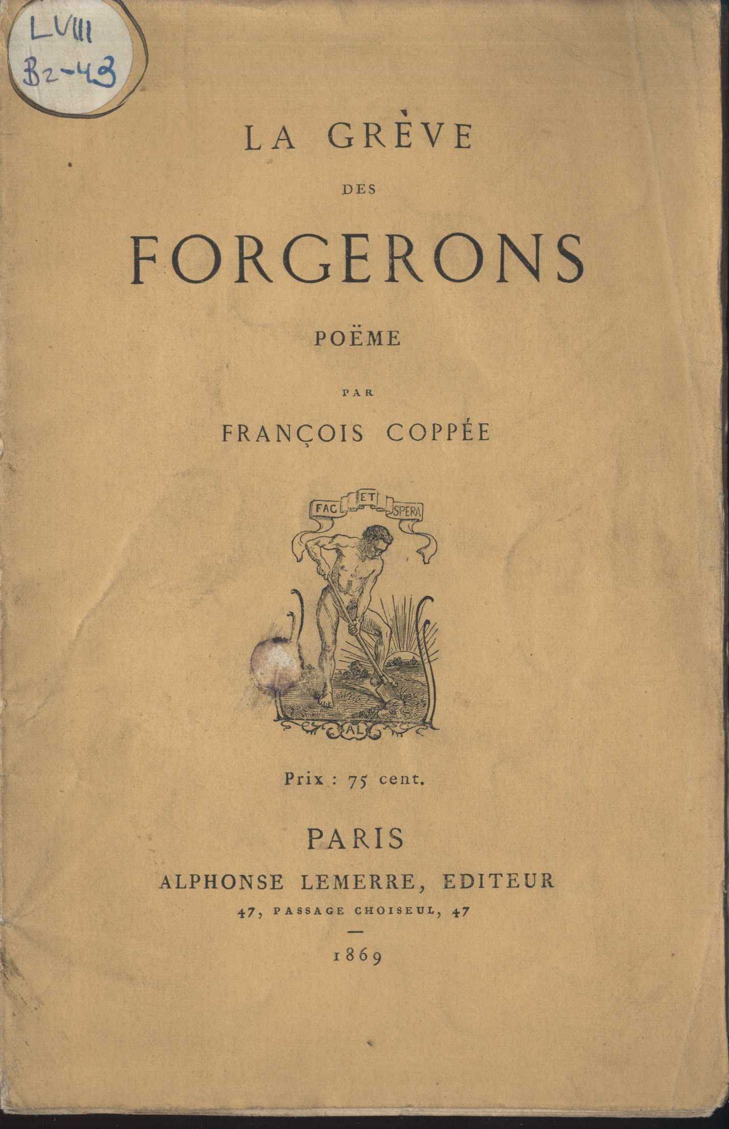 Title information La grève des Forgerons : poëme : / par François Coppée Personal name Coppée, François, 1842-1908 (Author) Další autoři Alphonse Lemerre, éditeur (Publisher) Imprimerie de J. Claye (Paris) (Printer) Publication Paris : Alphonse Lemerre, 1869 Manufacture (J. Claye) Scope 15 s. ISBN brož. Country France Language French Note Na obálce i na titulním listu nakladatelský signet. - Ozdobná linka. - Koncová viněta.