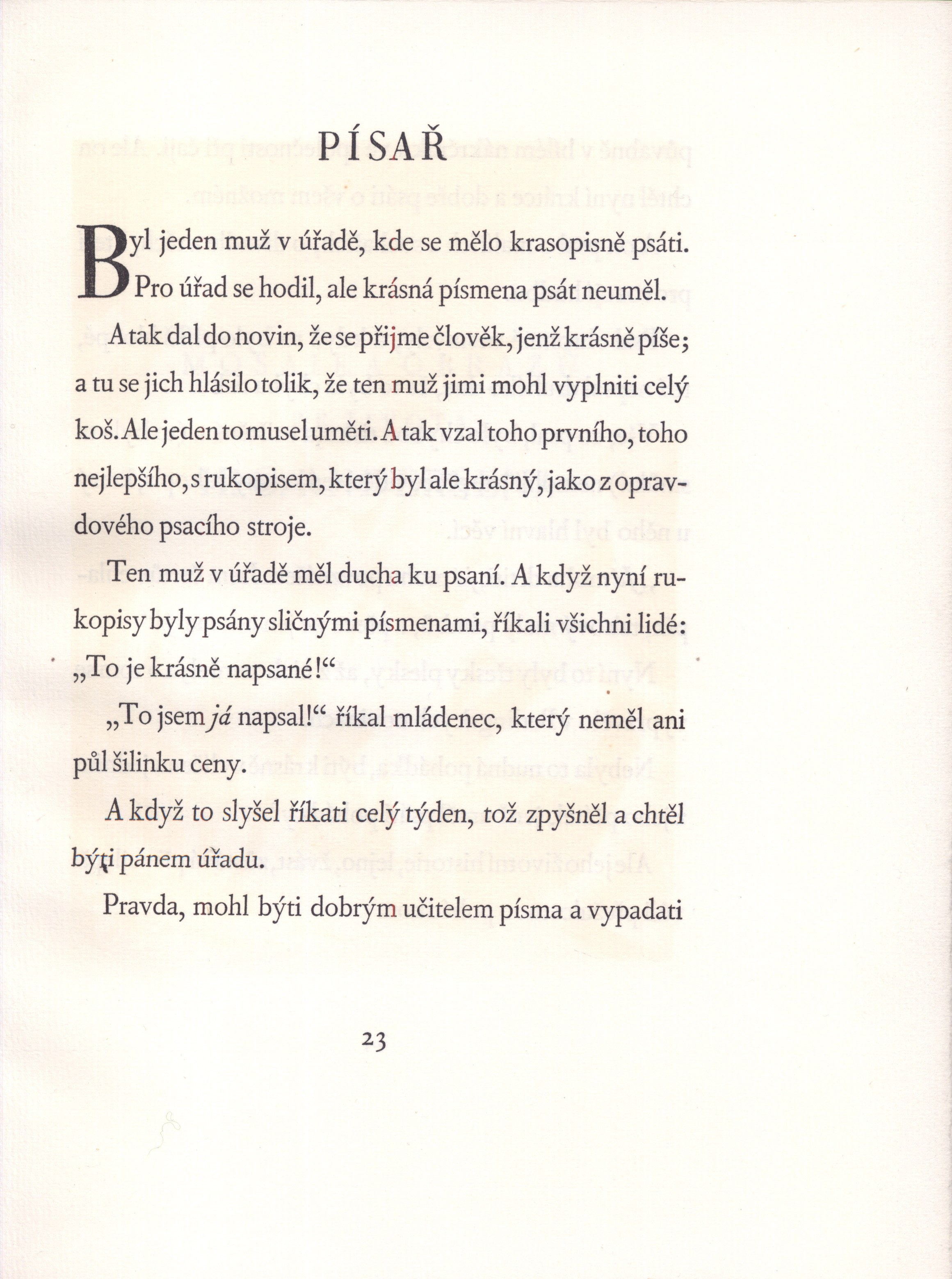 Document kind monografie Personal subjects Andersen, Hans Christian, 1805-1875 - dánský prozaik a básník Keywords dánská literatura * próza * Andersen H. Ch. * pohádky * překlad * ilustrace * lepty * Bouda C. * ilustrované knihy * číslovaný výtisk * bibliofilská vydání * bibliofilie UDC 821.113.4-3 * 82-3 * 82-34 * =030 * 762.2 * (084.1) * (0.027.6) * 090.1 Uživatelské pole PNP U sign. Topič osobní knihovna Topiče a Milady Blekastad. U sign. Topič 0744 (vázaný výtisk) pergamenová vazba zdobená rámcem ze tří jednoduchých linek a zlacenou ražbou na přední desce (iniciály HAC), zlacený název na hřbetu, zlacená horní ořízka (C. Bouda). - Vakát. - Dvoubarevný titulní list s vinětou (C. Bouda). - 3 celostránkové lepty (C. Bouda) s průsvitkami, bez podpisu. - Iniciály. - Studie: "Mosaika obrazů ze života H. C. Andersena" (K. Koval). - Poznámky (K. Koval). - Tiráž s číslem výtisku. - Vakát. - Zdobená i zadní strana vazby. - Ochranné pouzdro. U sign. Topič 0744 číslo výtisku (perem, šedočerně): "9." a (značkou vydavatelky?) "Šk" Tiráž: "H. C. Andersen. Pohádky. Tuto knihu přeložil a studii o autoru napsal Karel Koval. Tři lepty, grafická úprava a návrh na vazbu od Cyrila Boudy. Typy Fournierovými vytiskla dvoubarevně na papíru van Gelderově Průmyslová tiskárna Praze. Lepty tiskl Mirro Pegrassi v graf. ústavu A. de Pian. Vydala ji Olga Škábová v Plzni v březnu 1928 ve 120 výtiscích, číslovaných 1-120, z nichž prvních 40 svázal do pergamenu Karel Šilingr v Plzni. Kromě toho tištěno 30 neprodejných výtisků číslovaných I-XXX. Tento výtisk má číslo" U sign. Topič 0744 vazba na zadní straně jen mírně zašpiněná, zachovalý výtisk. Rozsah: 36, [8] s. Rozměr knihy: 27,2 cm; rozměr pouzdra: 28,3 cm Sáňka 1191 Call number Track No. Location Info Topič 0744 1810/2015 Sbírka