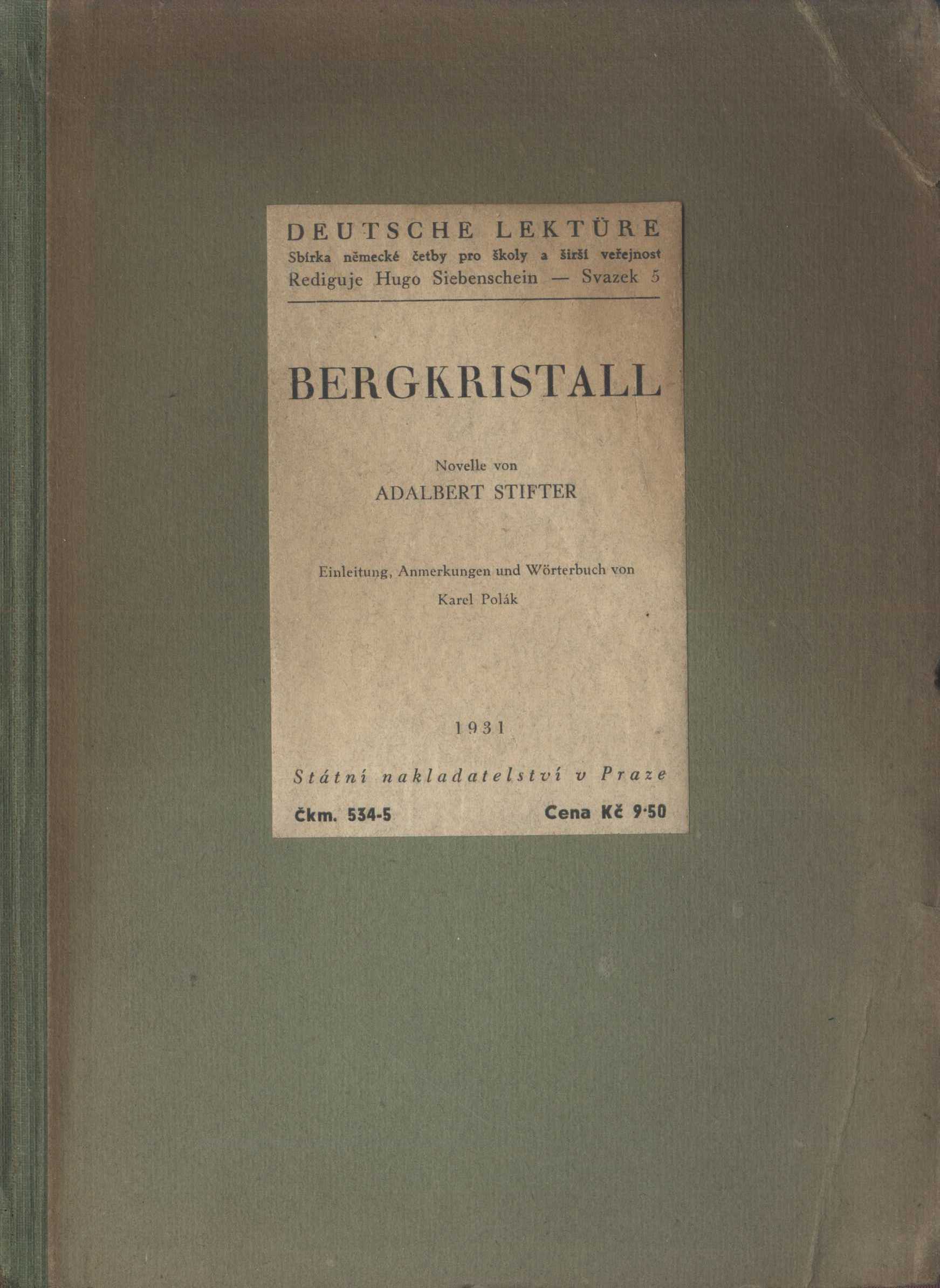 Title information Bergkristall : Novelle / von Adalbert Stifter ; Einleitung, Anmerkungen und Wörterbuch von Karel Polák Personal name Stifter, Adalbert, 1805-1868 (Author) Další autoři Polák, Karel, 1903-1956 (Author of introduction) Corporation Knihtiskárna Státního nakladatelství (Praha) (Printer) Státní nakladatelství (Publisher) Publication V Praze : Státní nakladatelství, 1931 Manufacture (Tiskárna Státního nakladatelství) Scope 112 s. ; 8° ISBN (váz.) Edition Deutsche Lektüre : sbírka německé četby pro školy a širší veřejnost sv. 5