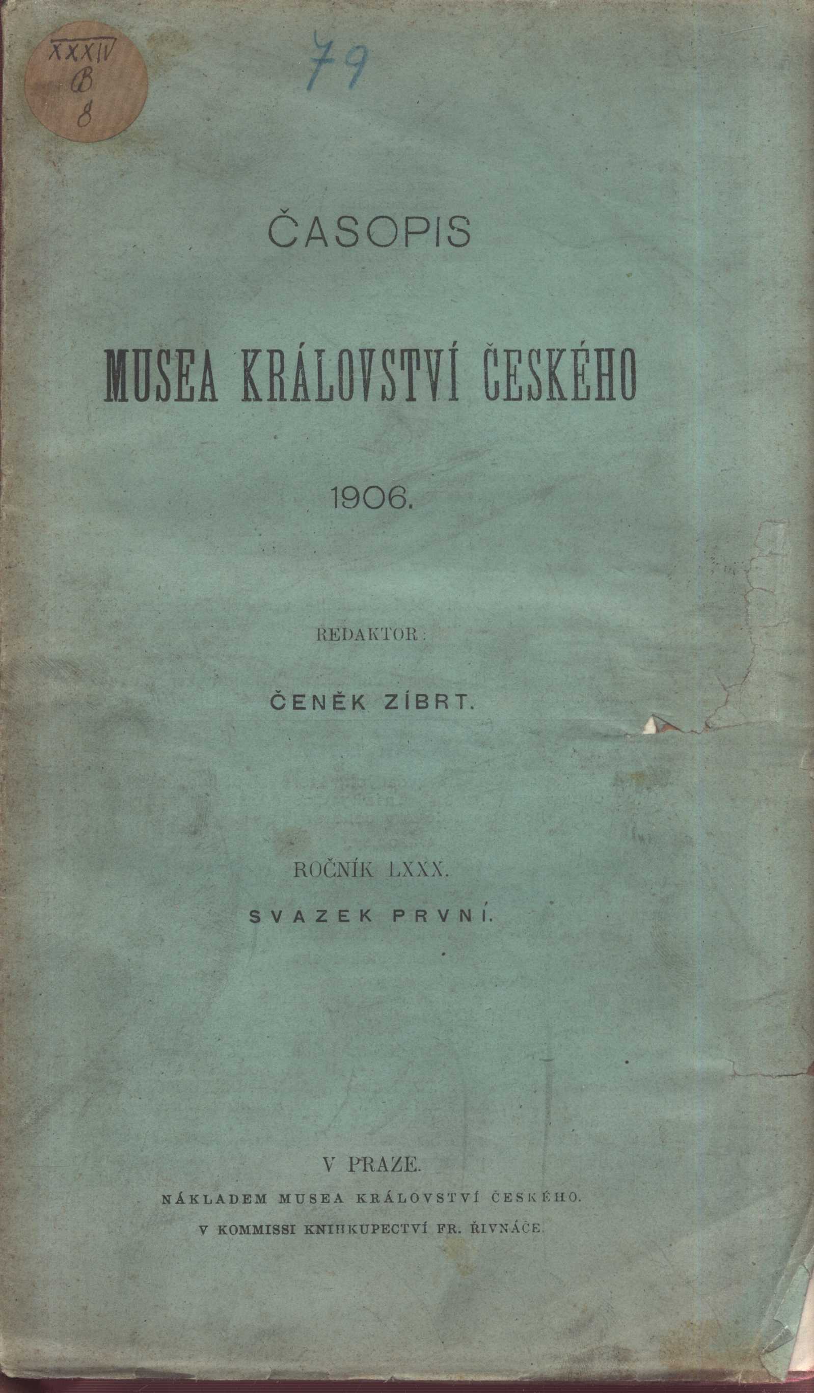 Title information Časopis Musea Království českého Další autoři Zíbrt, Čeněk, 1864-1932 (Redactor) Corporation České museum (Praha, Česko) (Publisher) Unie (tiskárna) (Printer) Roč., číslo Ročník 80, svazek 1-4, 1906 Publication V Praze : nákladem Musea Království českého, 1906 Manufacture Tiskem Unie Scope 617 stran Country Czech Republic Language Czech Note Identicky zdobená obálka každého čísla