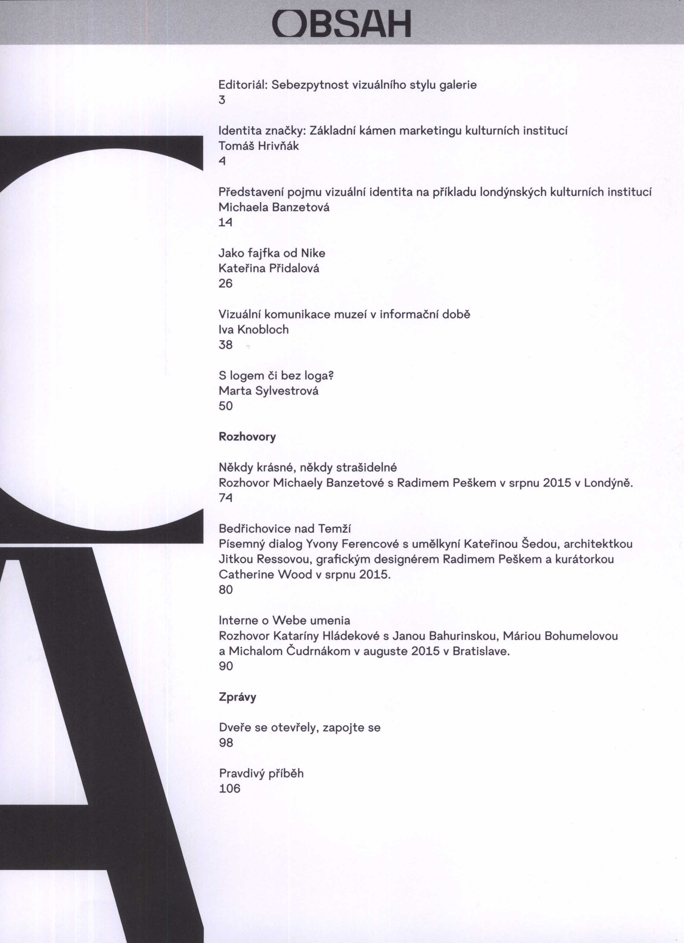 Title information Bulletin Moravské galerie v Brně. Č. 72, Vizuální identita muzeí a galerií. Další autoři Press, Jan, 1976- (Publishing director) Roč., číslo svazek 72, 2015 Publication Brno : Moravská galerie v Brně, 2015 Scope il., 110 s., 1 příl. ISBN brož. ISSN 0231-5793 Country Czech Republic Language Czech * Slovak * English Note Zdob. obálka. - Převážně barevné ilustrace a fotografie. - Text částečně slovensky a anglicky. - Obsahuje bibliografické odkazy a bibliografii. - Anglická resumé. - Přiložen plakát formátu A2 s ilustrací z obálky.