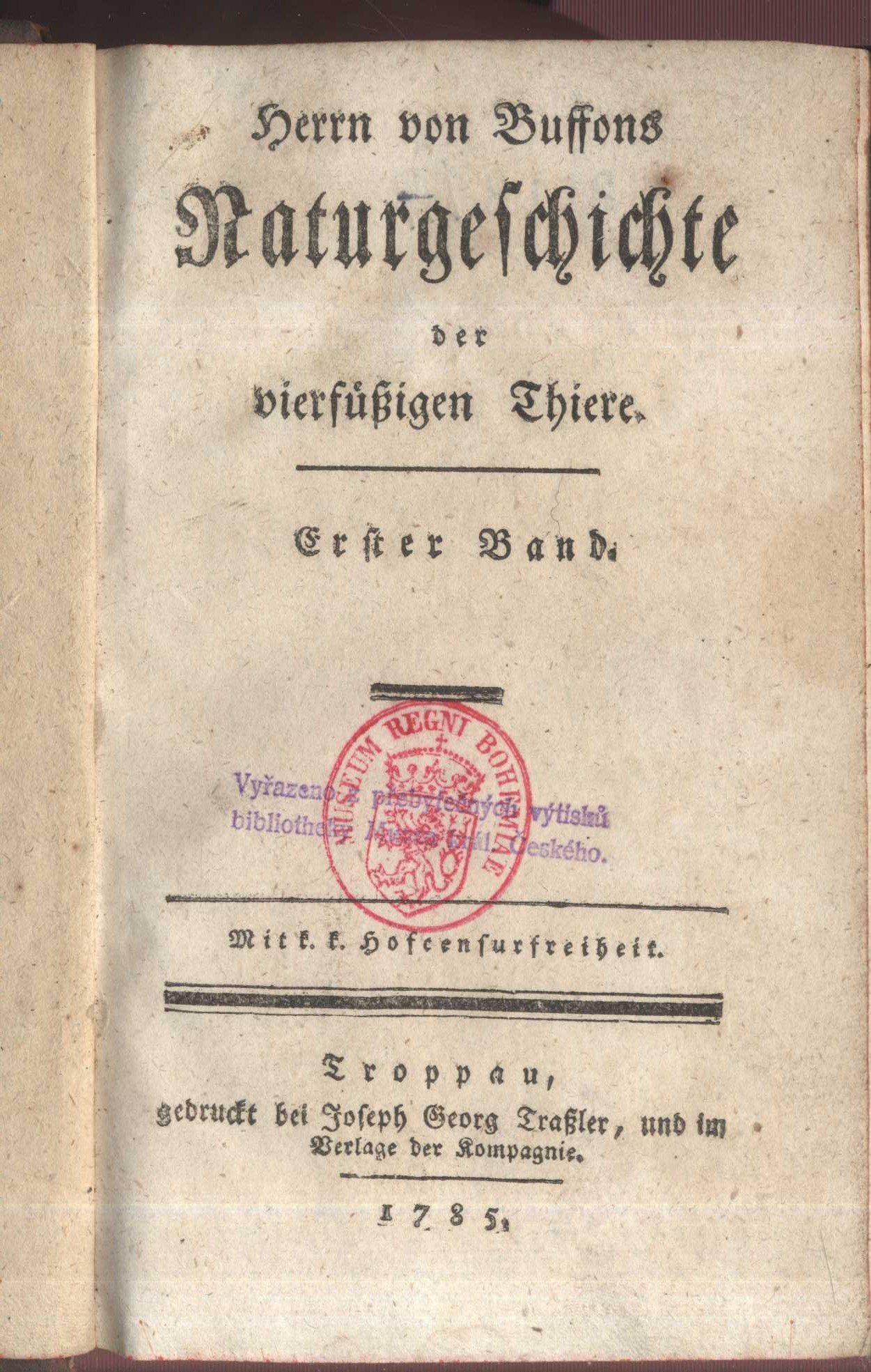 Title information Herrn von Buffons Naturgeschichte der vierfüßigen Thiere. Erster Band Personal name Buffon, Georges-Louis Leclerc, comte de, 1707-1788 (Author) Další autoři Trassler, Josef Jiří, zemř. 1816 (Publisher) Corporation Museum Království českého (Praha, Česko) (Former owner) Publication Troppau : Joseph Georg Traßler, 1785 Scope 448 s., xii l. obr. příl. : il. ISBN (váz.) Country Czech Republic Language German Language of the original French Note Německý text tištěný gotikou, latinský antikvou, arabská paginace ve vnějších horních rozích, signatury archů, poznámky pod čarou, stránkové kustody, ozdobné linky, verzály, dvanáct celostránkových kolorovaných rytin s vyobrazeními zvířat.