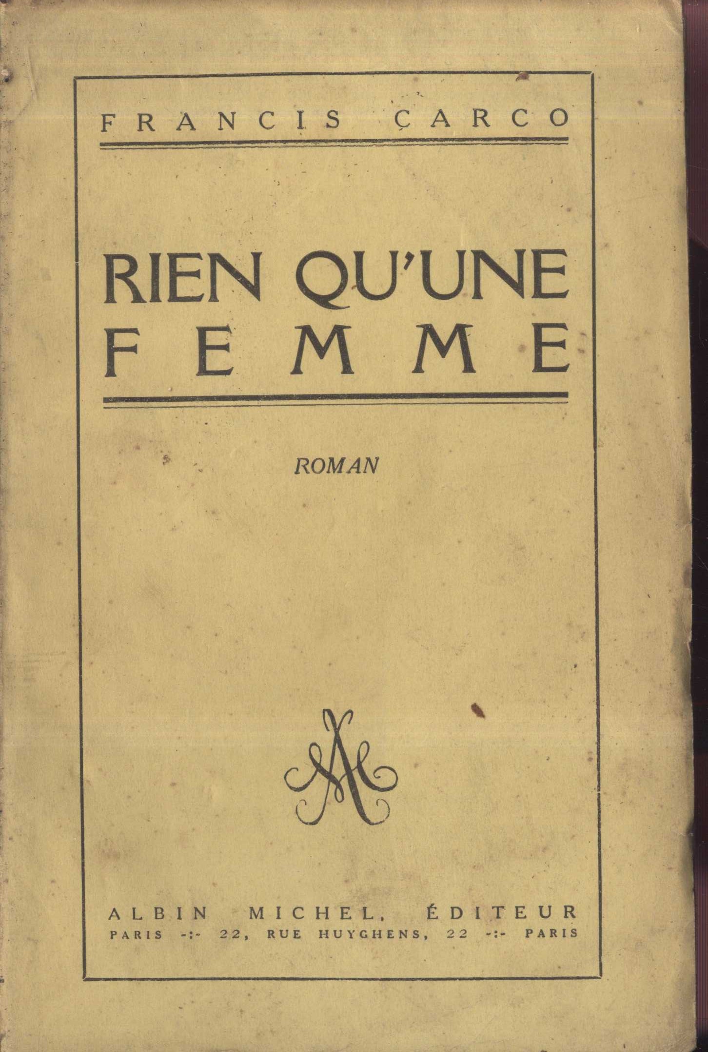 Title information Rien qu'une femme : roman / Francis Carco Personal name Carco, Francis, 1886-1958 (Author) Další autoři Albin Michel (nakladatelství, Paříž, Francie) (Publisher) Association linotypiste (tiskárna) (Printer) Publication Paris : Albin Michel, c1924 Manufacture Association linotypiste) Scope 256 s. Keywords francouzská literatura * francouzská próza * francouzský román * stol. 20., léta 20. Copy cnt. 1, currently available 1 Document kind monografie Call number VHB 2115