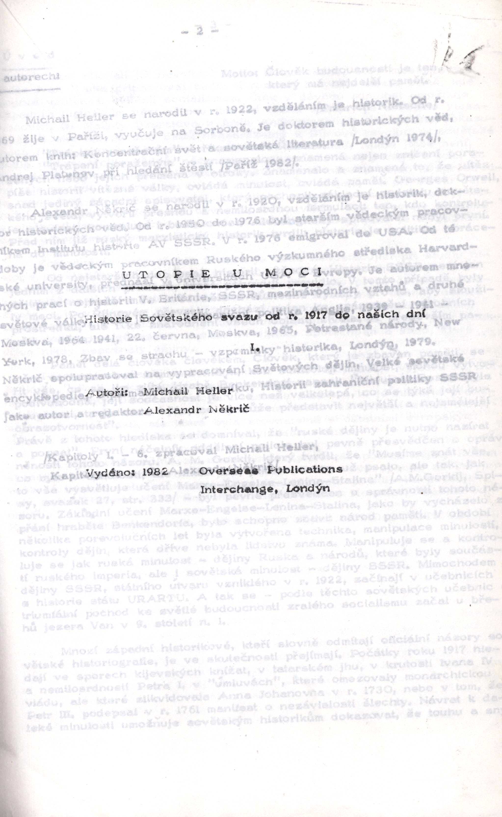 Title information Utopie u moci : historie Sovětského svazu od r. 1917 do našich dní. I. / Michail Heller, Alexandr Někrič Personal name Heller, Michel, 1922-1997 (Author) Další autoři Nekrič, Aleksandr Moisejevič, 1920-1993 (Author) Další var.názvy Historie Sovětského svazu od r. 1917 do našich dní Publication [Praha] : [nakladatel není známý], [1982-1988?] Scope 224 listů ; 20, 5 cm ISBN (brožováno) Country Czech Republic Language Czech Language of the original English Note Samizdat. - Listy vložené do papírových desek a sešité sešívačkou. - O autorech. - Úvod. - Strojopis na průklepovém papíře.