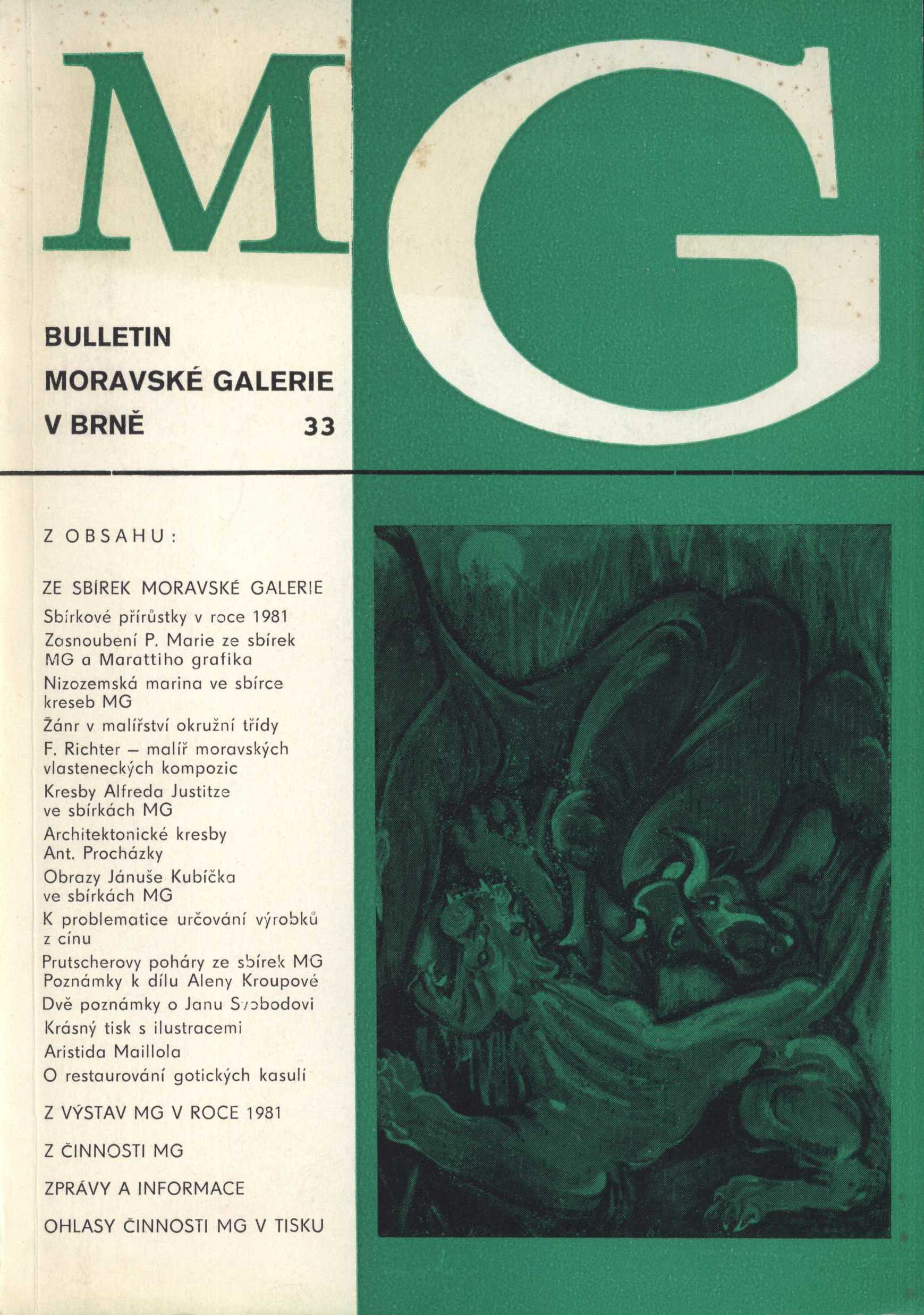 Bulletin Moravské galerie v Brně. -- svazek 33 (1982). -- Brno : Moravská galerie v Brně, 1982. -- Tisk, knižní výroba, n. p. -- 107 stran : ilustrace (černobílé) ; 21 cm. -- Zdob. obálka. - Černobílé fotografie a ilustrace. - Obsahuje bibliografii. - Ruská, německá, anglická a francouzská resumé. - Neprodejný výtisk, určeno pouze pro galerie, muzea, knihovny a Kruh přátel MG.. -- Odpovědný redaktor: Jiří Hlušička. -- Grafická úprava: Anna Hlušičková. -- ISBN : (Brožováno).