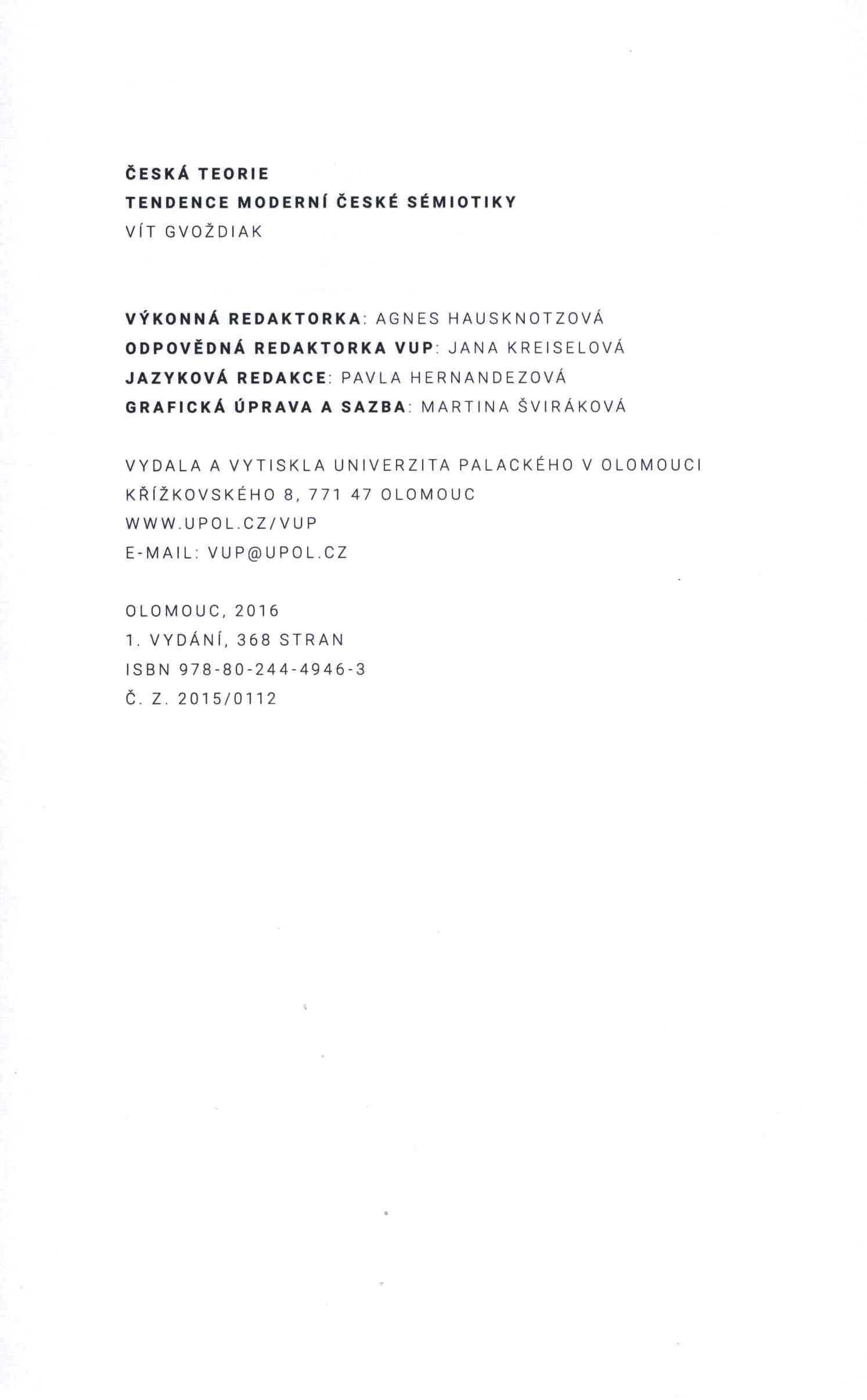 Note Obálkový podnázev: tendence moderní české sémiotiky. - Zdobená barevná obálka. - Obsah. - Úvod. - Obsahuje bibliografii a rejstřík. - České a anglické resumé. - Anotace knihy na zadní straně obálky.