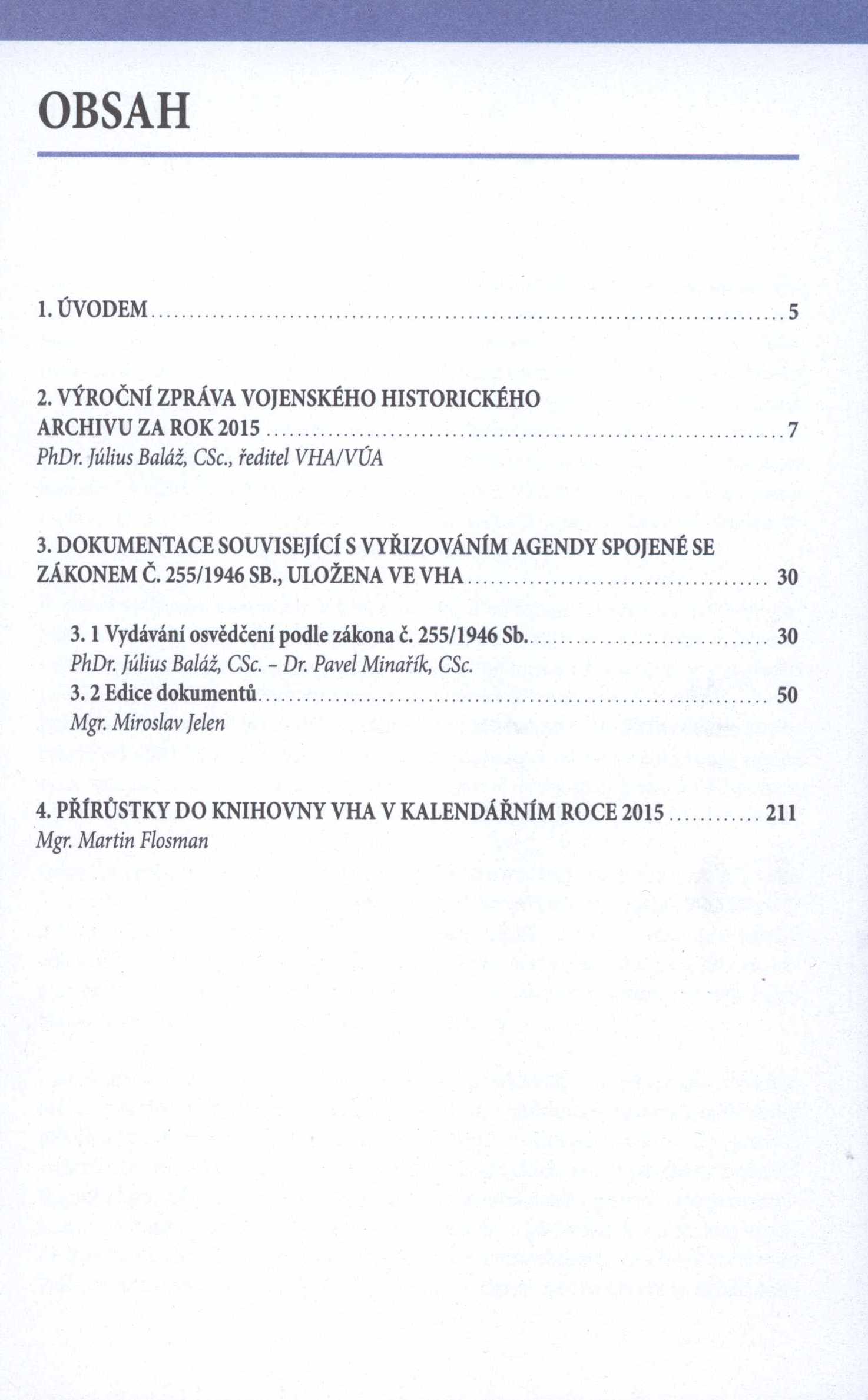 Title information Ročenka 2015 / Vojenský historický archiv Main entry-corp. Vojenský historický archiv (Author) Další autoři Baláž, Július, 1959- (Compiler) Jelen, Miroslav, 1978- (Compiler) Schulzová, Libora (Book designer) Corporation Česko. Ministerstvo obrany (Publisher) Vojenský geografický a hydrometeorologický úřad (Printer) Roč., číslo 2015 Edition statement 1. vydání Publication Praha : Ministerstvo obrany České republiky - VHÚ, 2016 Manufacture Dobruška : Vojenský geografický a hydrometeorologický úřad Scope 221 stran : ilustrace, faksimile ; 21 cm ISBN 978-80-7278-689-3 (brožováno) Country Czech Republic Language Czech Note Zdob. obálka. - Barevné i čb. fotografie a faksimile dokumentů. - Obsahuje bibliografii. - Neprodejné