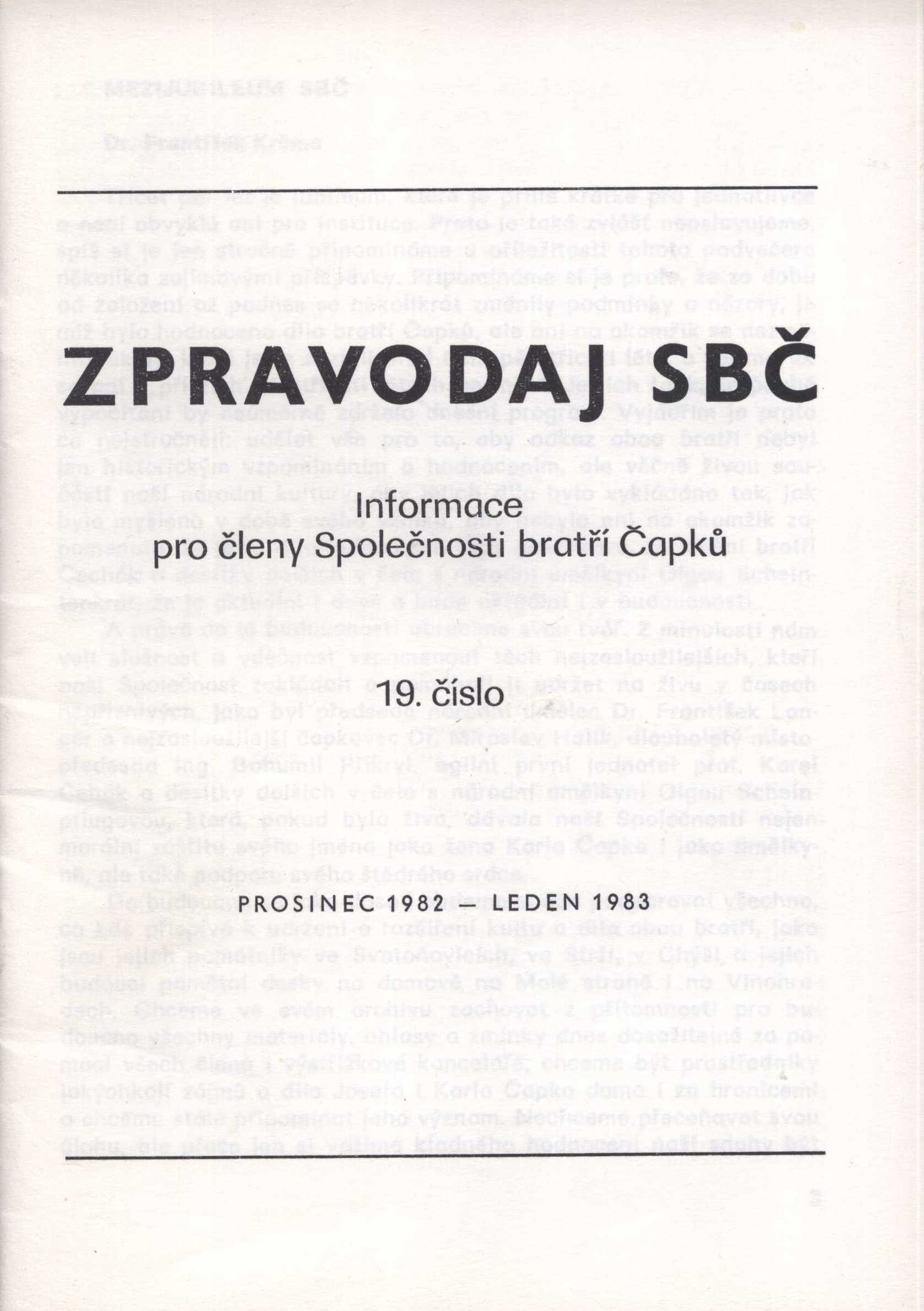 Title information Zpravodaj SBČ : informace pro členy Společnosti bratří Čapků Další autoři Zdeněk, Otomar, 1903-1994 (Redactor) Krčma, František, 1910-1996 (Redactor) Novák, Jan Zdeněk (Redactor) Corporation Tiskařské závody, n.p. (Printer) Roč., číslo Číslo 17-19, 1982 Další var.názvy Zpravodaj Společnosti bratří Čapků Publication Praha : Společnost bratří Čapků, 1982 Manufacture Tiskařské závody n. p. Scope 21 cm ISSN 1805-7527 Country Czech Republic Language Czech Note Neprodejný výtisk jen pro vnitřní potřebu Společnosti bratří Čapků.