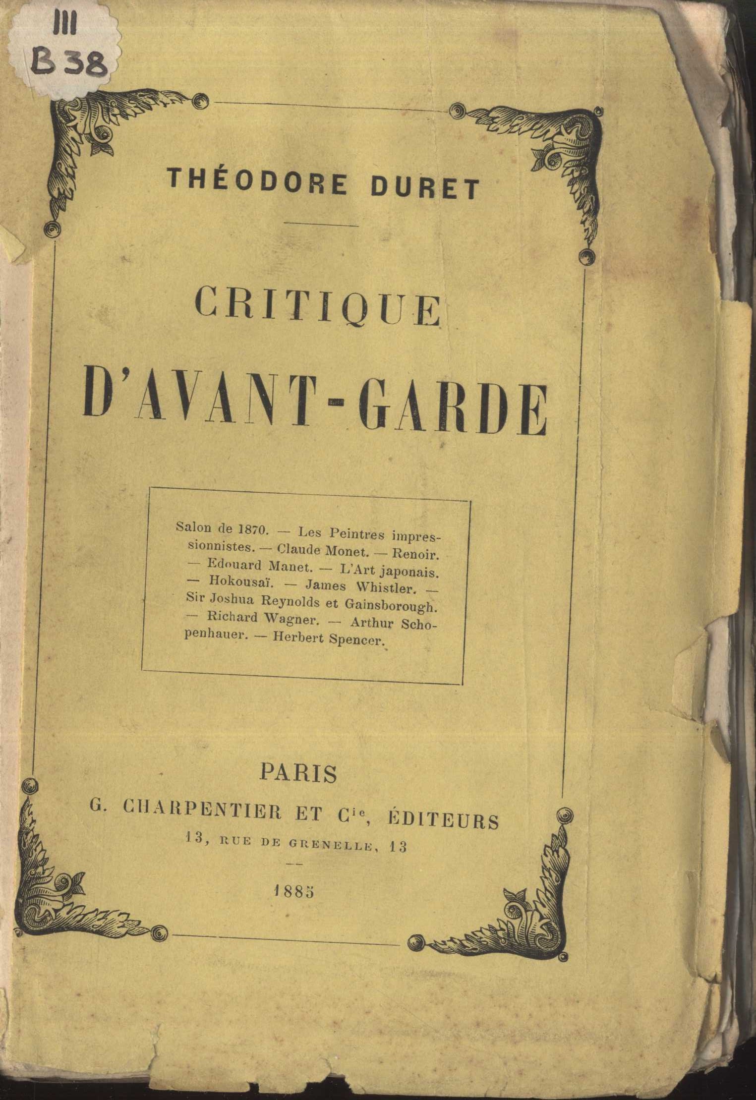 Title information Critique d'avantgarde / par Th. Duret Personal name Duret, Théodore, 1838-1927 (Author) Další autoři Bibliothèque-Charpentier (Paris, Francie) (Publisher) Chamerot et Renouard (Paris, Francie) (Printer) Publication Paris : G. Charpentier et Cie, éditeurs, 1885 Manufacture Paris : Typ. G. Chamerot, 1885 Scope 328 stran ISBN (brožováno) Country France Language French Note Přední strana obálky zdobena rámcem. - V rámci nákladu vyšlo osm výtisků na holandu. - Nakladatelská reklama.