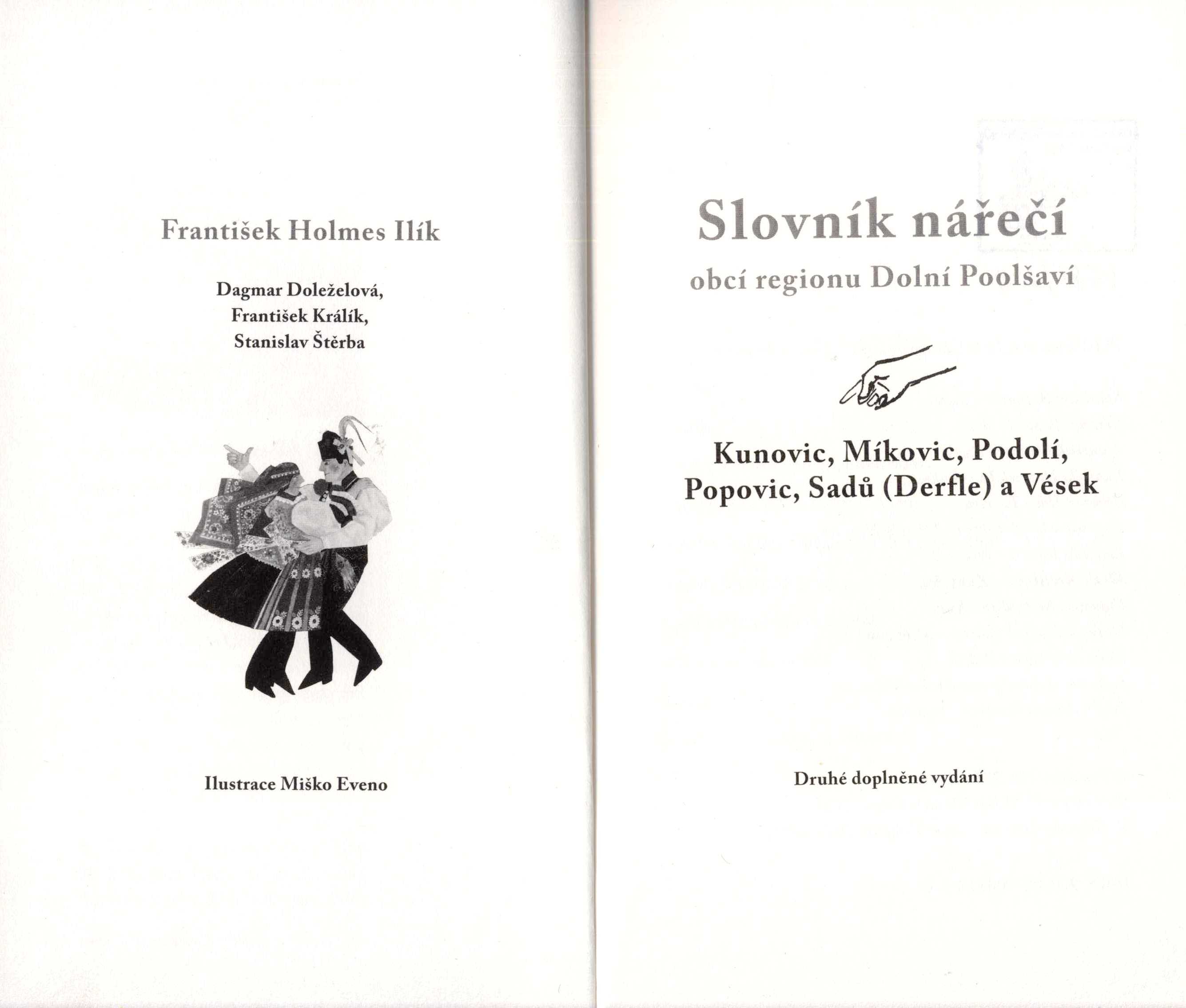 1. Title informationSlovník nářečí obcí regionu Dolní Poolšaví : Kunovic, Míkovic, Podolí, Popovic, Sadů (Derfle) a Vések / František Holmes Ilík, Dagmar Doleželová, František Králík ; illustrace Miško Eveno