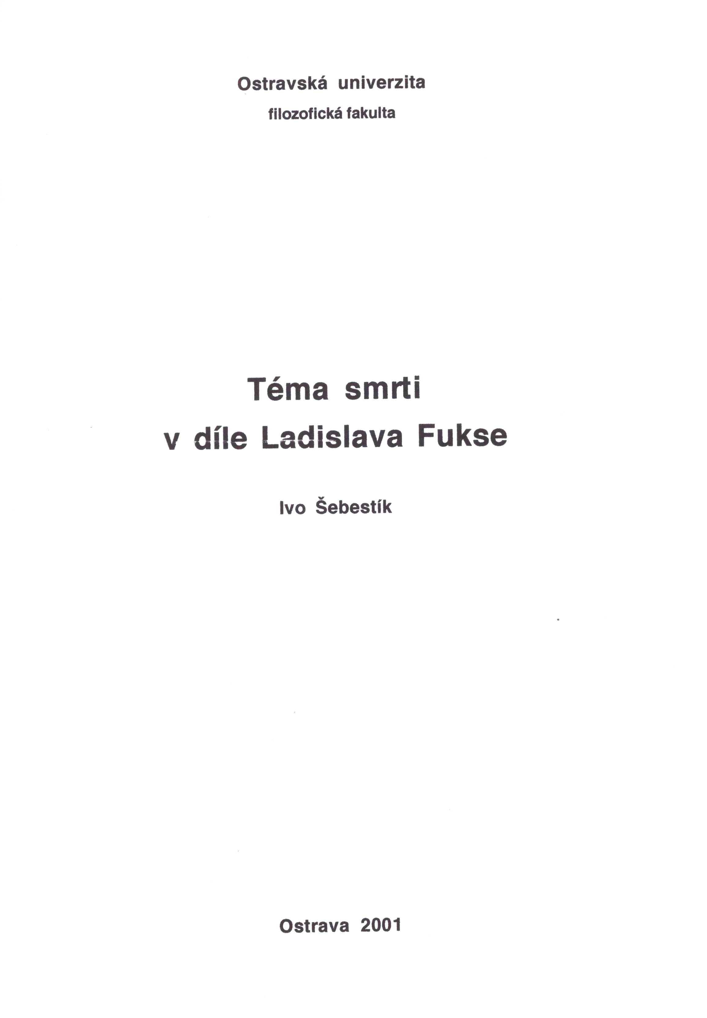 Title information Téma smrti v díle Ladislava Fukse / Ivo Šebestík Personal name Šebestík, Ivo, 1959- (Author) (Publisher) Další autoři Ostravská univerzita. Filozofická fakulta (Other) Publication Ostrava : Ivo Šebestík, 2001 Scope 121 stran, 4 strany přílohy ; 30 cm ISBN (Vázáno) Country Czech Republic Language Czech Note Černá koženková vazba se zlaceným vytlačovaným textem. - Citáty. - Prohlášení. - Obsah. - Úvod. - Jednotlivé části. - Závěr. - Příloha.