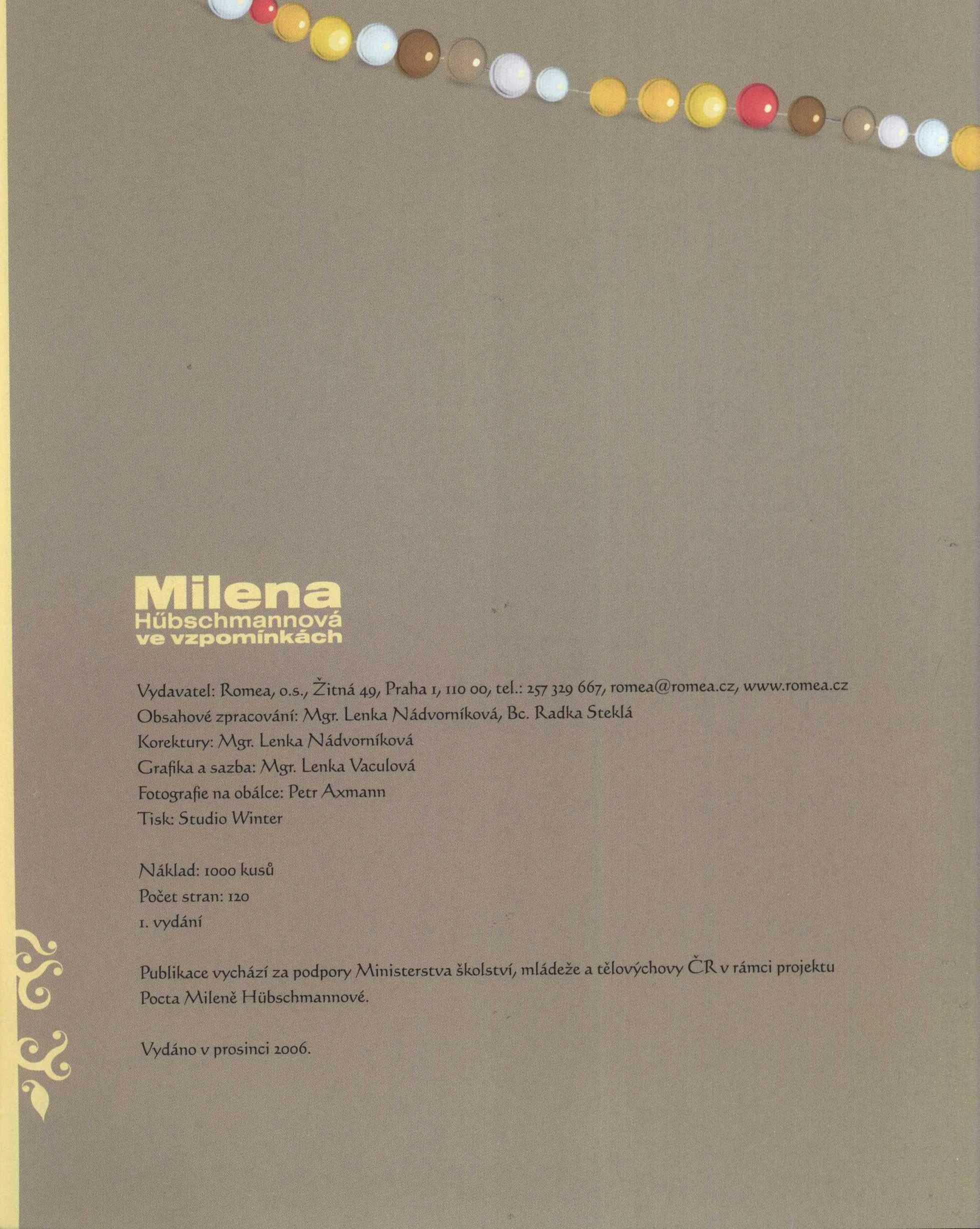 Title information Milena Hübschmannová ve vzpomínkách / obsahové zpracování Lenka Nádvorníková, Radka Steklá ; grafika a sazba: Lenka Vaculová ; fotografie na obálce: Petr Axmann Další autoři Nádvorníková, Lenka, (Compiler) 1981- Steklá, Radka, 1981- (Compiler) Vaculová, Lenka, 1976- (Book designer) (Compositor) Balážová, Jarmila, 1972- (Author of introduction) Axmann, Petr, 1974- (Photographer) Corporation Romea (sdružení) (Publisher) Studi Winter (tiskárna a grafické studio) (Printer) Edition statement 1. vydání Publication Praha : Romea, 2006 Praha : Romea, o.s., 2006 Manufacture Praha : Studi Winter Scope 117 stran : ilustrace (některé barevné), portréty ; 22 cm ISBN 80-239-9085-3 (v knize neuvedeno ; brožováno) Country Czech Republic Language Czech * Slovak Note Barevná fotografie M. Hüschmannové na obálce, žlutý text. - Rozložený, barevný zdobený titulní list se žlutým textem. - Tónované foto M. Hübschmannové na rubu titulního listu. - Obsah. - Předmluva J. Balážové. - Různobarevné listy s texty jednotlivých autorů (na konci příspěvku stručná biografie autora). - Barevné a černobílé fotografie. - Životopis MH od P. Wagnera. - Obrazová příloha (černobílé, tónované a barevné fotografie s popisky). - Poděkování. - Pestrobarevná pruhovaná zadní strana obálky.