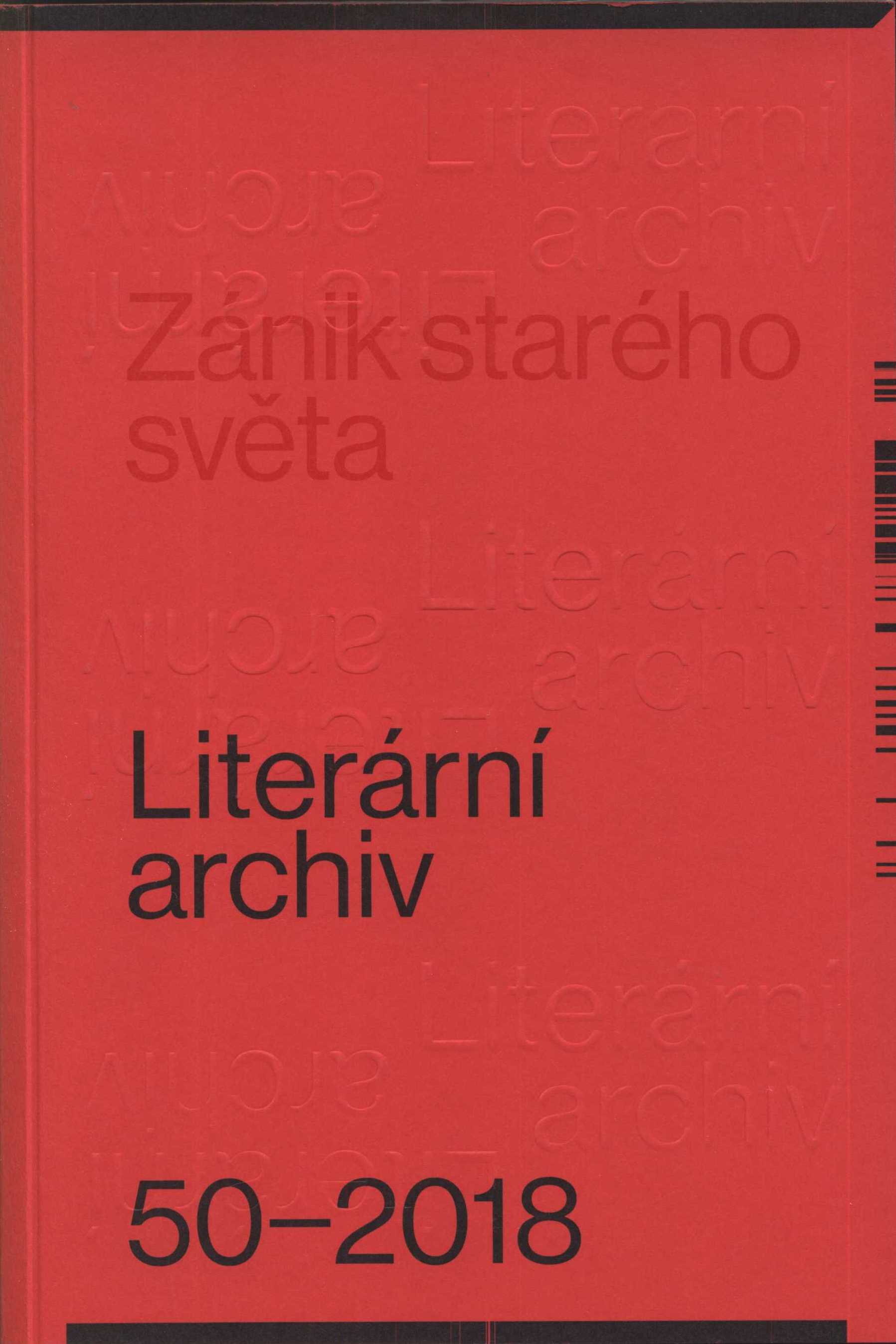 Title information Literární archiv : sborník Památníku národního písemnictví = Jahrbuch des Museums der tschechischen Literatur = Annual of the Museum of Czech Literature = Almanach du Musée de la littérature tchèque. Zánik starého světa. Reflexe roku 1918 v česky a německy psané literatuře Další autoři Sudzinová, Tereza, 1991- (Publishing director) Černovský, Pavel, 1980- (Translator) Bohner, Sébastien, 1975- (Book designer) Bosák, Petr, 1985- (Book designer) Jansa, Robert, 1985- (Book designer) Macháček, Adam, 1980- (Book designer) Corporation Památník národního písemnictví (muzeum literatury) (Publisher) Indigoprint (tiskárna) (Printer) Roč., číslo 50, 2018 Edition statement Vydání první Publication Praha : Památník národního písemnictví, 2018 Manufacture Indigoprint Scope 364 stran : ilustrace, fotografie, portréty, faksimile ; 23 cm ISBN 978-80-87376-52-2 (v knize neuvedeno ; brožováno) ISSN 0231-5904 Country Czech Republic Language Czech Note Zdob. obálka. - Čb. i barevné ilustrace, fotografie, portréty a faksimile. - 250 výtisků