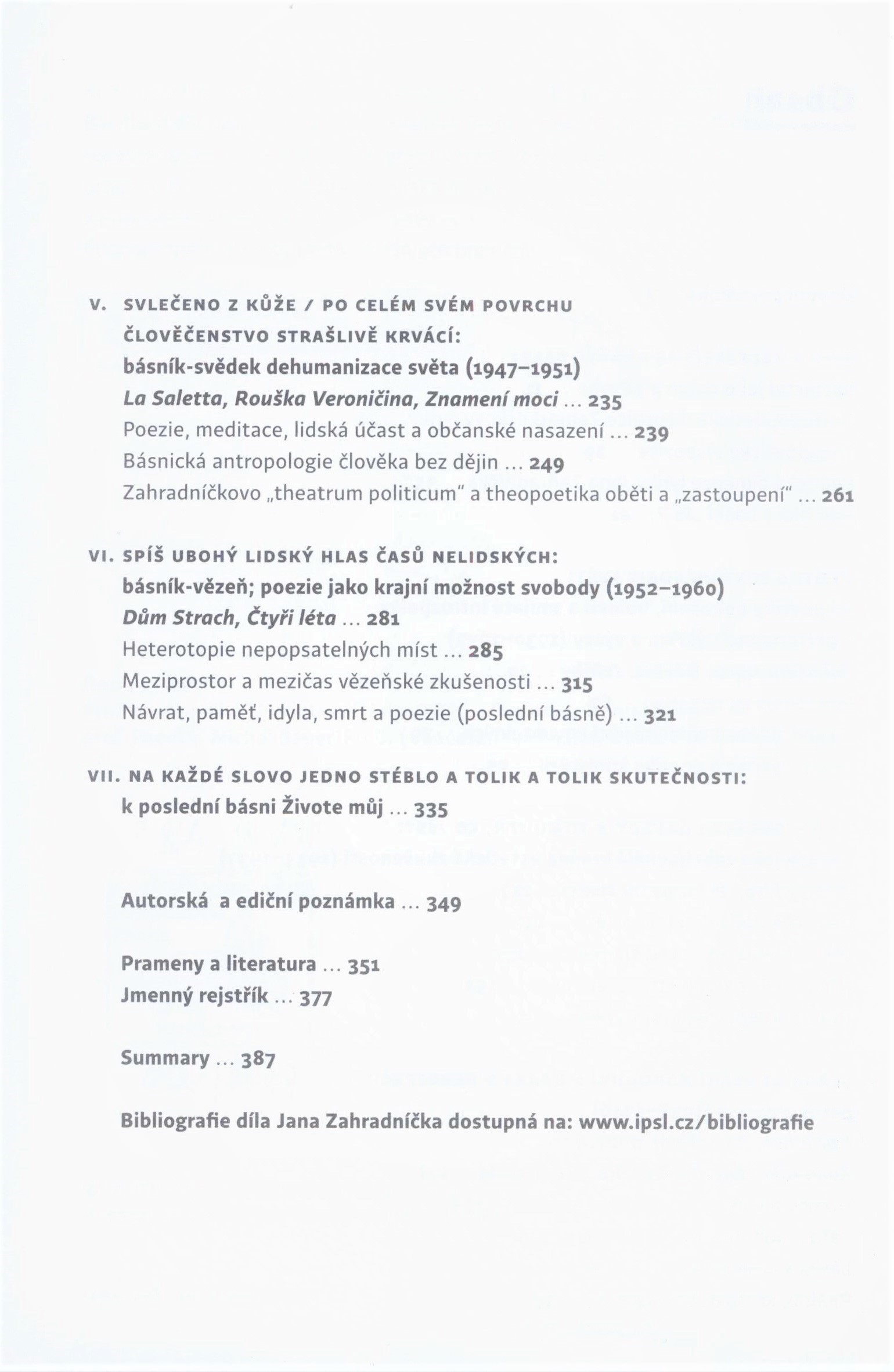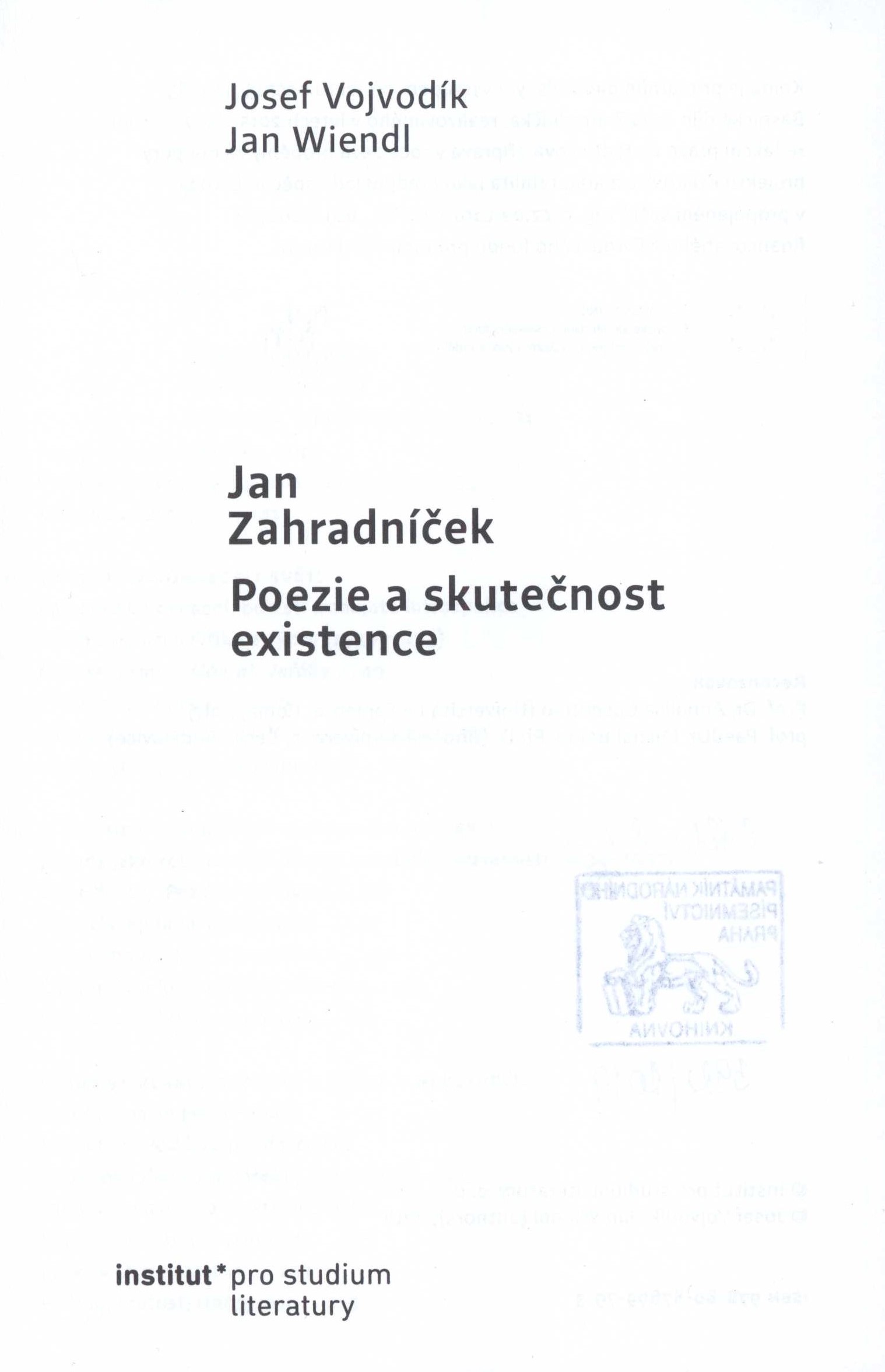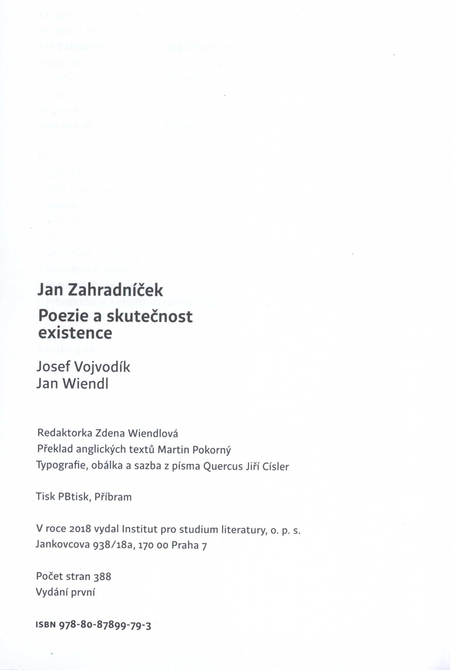 Title information Jan Zahradníček : poezie a skutečnost existence / Josef Vojvodík, Jan Wiendl ; typografie, obálka a sazba z písma Quercus Jiří Císler Personal name Vojvodík, Josef, 1964- (Author) Další autoři Wiendl, Jan, 1969- (Author) Císler, Jiří, 1971- (Typographer) (Bookjacket designer) (Compositor) Corporation Institut pro studium literatury (nakladatelství) (Publisher) PBtisk (tiskárna) (Printer) Edition statement Vydání první Publication Praha : Institut pro studium literatury, 2018 Manufacture Příbram : PBtisk Scope 387 stran ; 22 cm ISBN 978-80-87899-79-3 (vázáno) Country Czech Republic Language Czech Note Modrá obálka s červeným faksimile podpisu J. Zahradníčka, dvoubarevný text (i na hřbetu). - Na přední záložce anotace knihy, na zadní stručná biografie a bibliografie autorů. - Modrá vazba s bílým faksimile podpisu J. Zahradníčka, bílý text na hřbetu. - Obsah. - Úvodní poznámka autorů. - Texty, ukázky básní. - Autorská a ediční pozámka. - Přebal.
