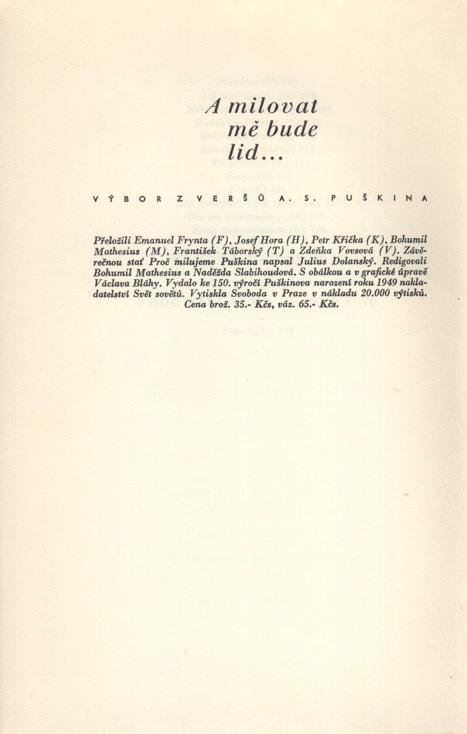 Title information A milovat mě bude lid ... : výbor z veršů A.S. Puškina / přeložili Emanuel Frynta, Josef Hora, Petr Křička, Bohumil Mathesius, František Táborský a Zdeňka Vovsová Personal name Puškin, Aleksandr Sergejevič, 1799-1837 (Author) Další autoři Frynta, Emanuel, 1923-1975 (Translator) Hora, Josef, 1891-1945 (Translator) Křička, Petr, 1884-1949 (Translator) Mathesius, Bohumil, 1888-1952 (Translator) Táborský, František, 1858-1940 (Translator) Bergrová, Zdenka, 1923-2008 (Translator) Dolanský, Julius, 1903-1975 (Author of afterword, colophon, etc.) Bláha, Václav, 1922-2021 (Bookjacket designer) Zink, Karel, 1889-1975 (Dedicator) Zinková, Viola, 1925-2017 (Dedicatee) Corporation Svět sovětů (nakladatelství) (Publisher) Svoboda (tiskárna) (Printer) Publication Praha : Svět sovětů, 1949 Manufacture V Praze : Svoboda Scope 179 stran ; 22 cm ISBN (Brožováno) Country Czech Republic Language Czech Language of the original Russian Note Závěrečnou stať Proč milujeme Puškina napsal Julius Dolanský