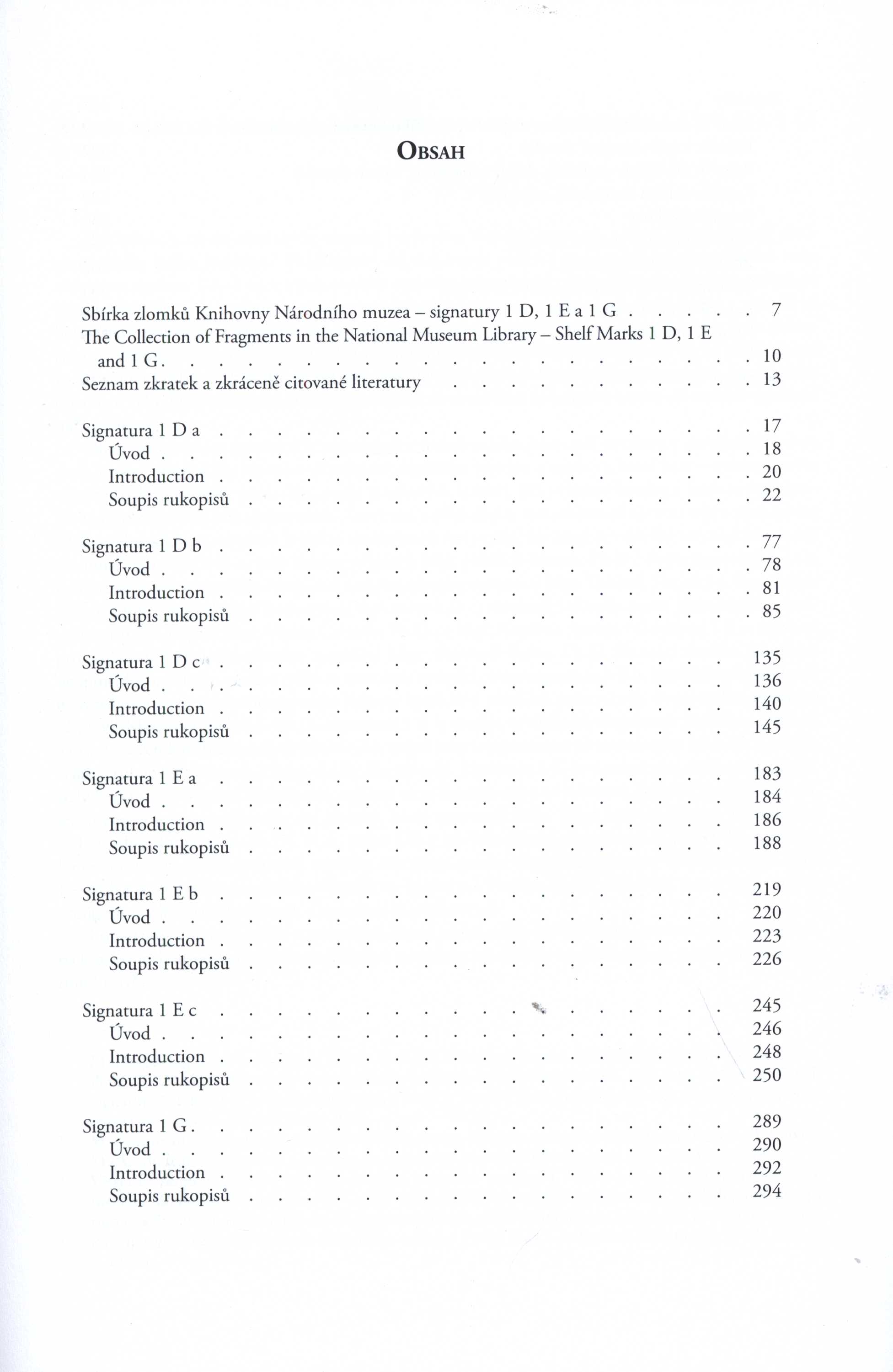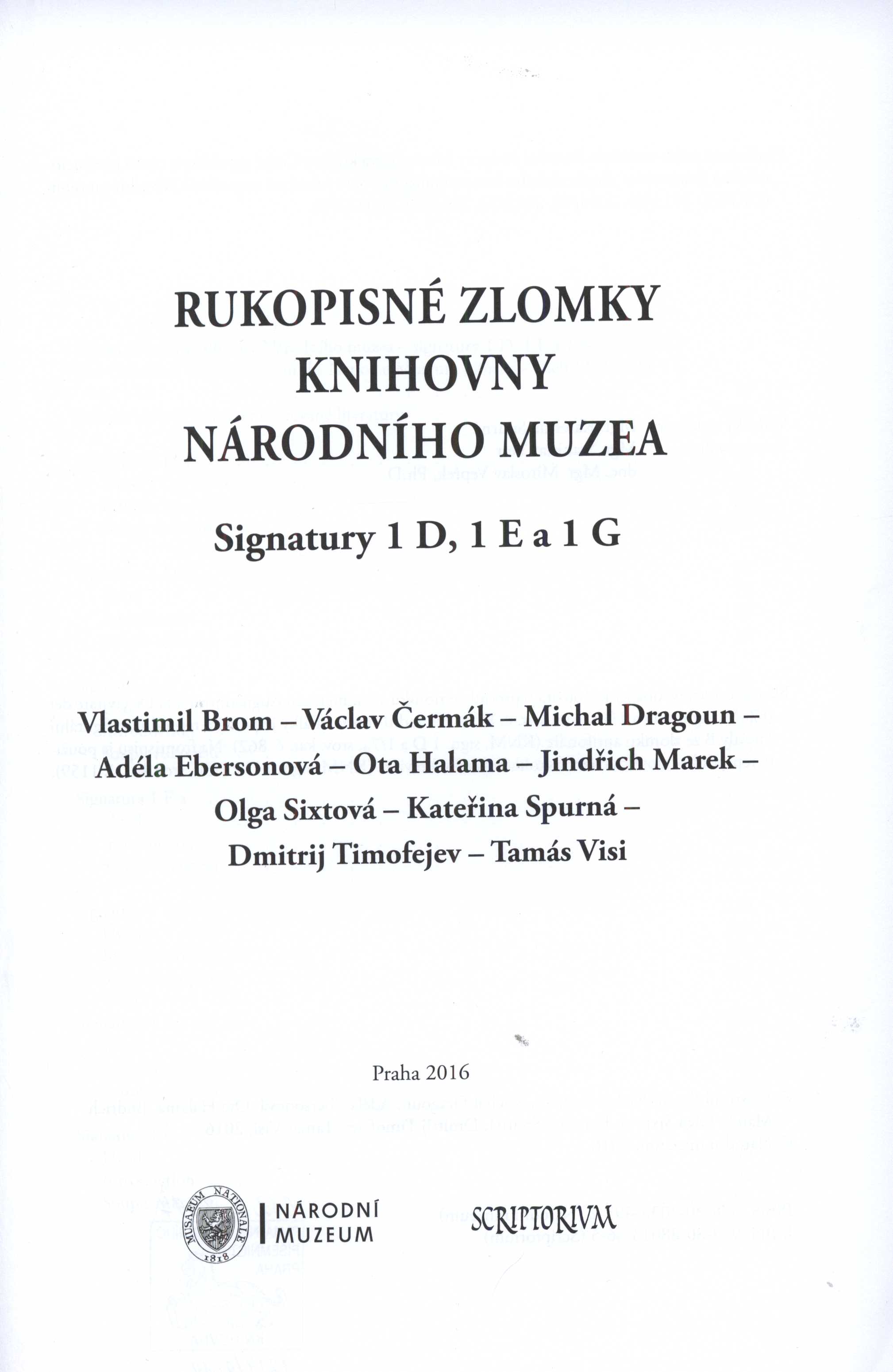 Názvové údaje Rukopisné zlomky Knihovny Národního muzea : signatury 1 D, 1 E a 1 G / Vlastimil Brom, Václav Čermák, Michal Dragoun, Adéla Ebersonová, Ota Halama, Jindřich Marek, Olga Sixtová, Kateřina Spurná, Dmitrij Timofejev, Tamás Visi ; obálka Jana Ratajová, Tomáš Rataj ; grafická úprava a předtisková příprava Tomáš Rataj Osobní jméno Brom, Vlastimil, 1977- (Autor) Další autoři Čermák, Václav, 1974- (Autor) Dragoun, Michal, 1974- (Autor) Ebersonová, Adéla, 1987- (Autor) Halama, Ota, 1974- (Autor) Marek, Jindřich, 1978- (Autor) Sixtová, Olga, 1968- (Autor) Spurná, Kateřina, 1985- (Autor) Timofejev, Dmitrij, 1987- (Autor) Visi, Tamás, 1974- (Autor) Ratajová, Jana, 1972- (Autor obálky) Rataj, Tomáš, 1973- (Autor obálky) (Knižní grafik) Korp. Národní muzeum (Praha, Česko) (Nakladatel, vydavatel) Scriptorium, Spolek pro nekomerční vydávání odborné literatury (Nakladatel, vydavatel) PBtisk (tiskárna) (Tiskař) Údaje o vydání Vydání první Nakladatel Praha : Národní muzeum : Scriptorium, 2016 Výrobce Příbram : PBtisk Rozsah 373 stran ; 28 cm ISBN 978-80-7036-493-2 (Národní muzeum ; vázáno) 978-80-88013-36-5 (Scriptorium ; vázáno) Země vyd. Česko Jazyk dok. čeština * angličtina Jazyk orig. čeština Poznámky Na přední straně obálky je použita reprodukce zlomku s fragmentem Augustinova díla De civitate dei. - Na zadní straně obálky je použita reprodukce figurální iniciály B ze zlomku antifonáře. - Na frontispisu je použita reprodukce zlomku charvátskohlaholského breviáře.