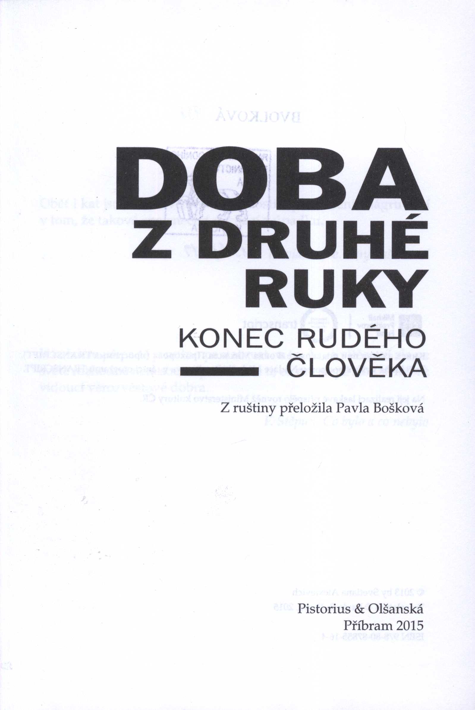 Title information Doba z druhé ruky : konec rudého člověka / Světlana Alexijevičová ; z ruštiny přeložila Pavla Bošková ; rejstřík vybraných jmen, glosář reálií a přehled důležitých dat nejnovějších sovětských a ruských dějin sestavil Libor Dvořák ; obálku a typografii navrhl Lubomír Šedivý Personal name Aleksìjevìč, Svjatlana Aljaksandraŭna, 1948- (Author) Další autoři Bošková, Pavla, 1973- (Translator) Dvořák, Libor, 1948- (Commentator) Šedivý, Lubomír, 1955- (Bookjacket designer) (Typographer) Corporation Pistorius & Olšanská (nakladatelství) (Publisher) Akcent tiskárna Vimperk (Printer) Edition statement Vydání první Publication Příbram : Pistorius & Olšanská, 2015 Manufacture Vimperk : Akcent Scope 492 stran ; 21 cm ISBN 978-80-87855-16-4 (vázáno) Country Czech Republic Language Czech Language of the original Russian Note Zdobená poloplátěná vazba. - Rejstřík vybraných jmen. - Glosář reálií. - Historická data nejnovějších sovětských a ruských dějin (1985-2014)