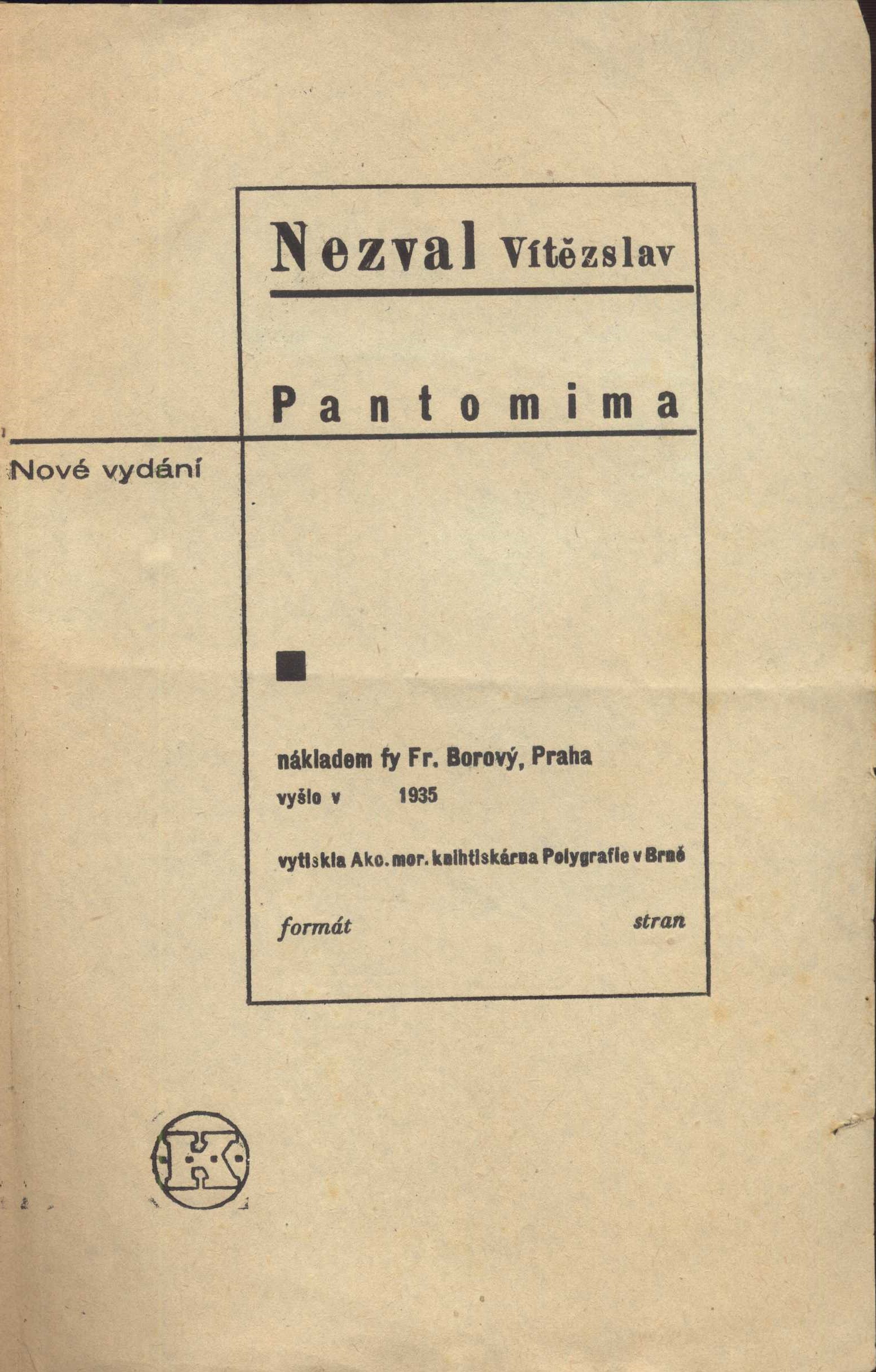Pantomima : (korektura) / Vítězslav Nezval. -- Nové vydání. -- Praha : Fr. Borový, 1935. -- V Brně : Akc. moc. knihtiskárna Polygrafie. -- 224 stran : ilustrace ; 21 cm. -- Korektorský výtisk v ochranném rozkládacím pouzdru. -- ISBN : (Brožovano).