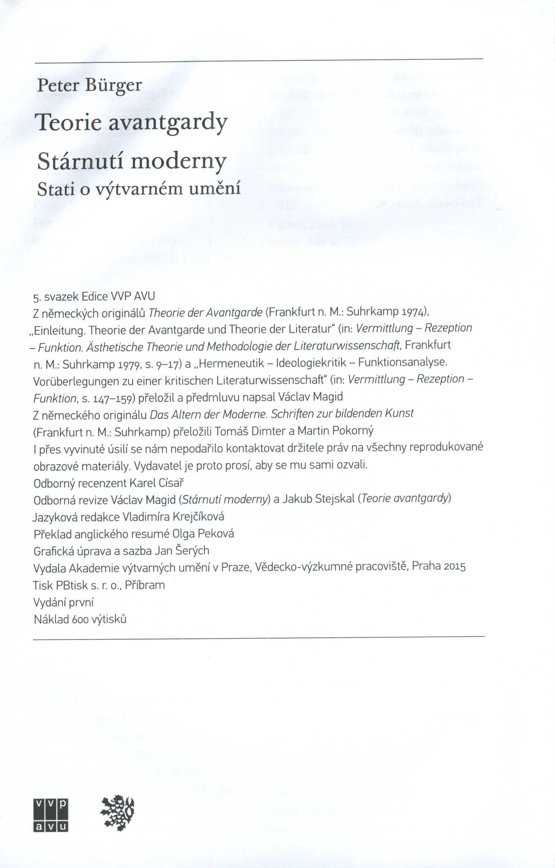 $a Teorie avantgardy ; $b Stárnutí moderny : stati o výtvarném umění / $c Peter Bürger ; z německých originálů Theorie der Avantgarde ... přeložil a předmluvu napsal Václav Magid ; z německého originálu Das Altern der Moderne ... přeložili Tomáš Dimter a Martin Pokorný ; překlad anglického resumé Olga Peková ; grafická úprava a sazba Jan Šerých 250 $a Vydání první 264 -1