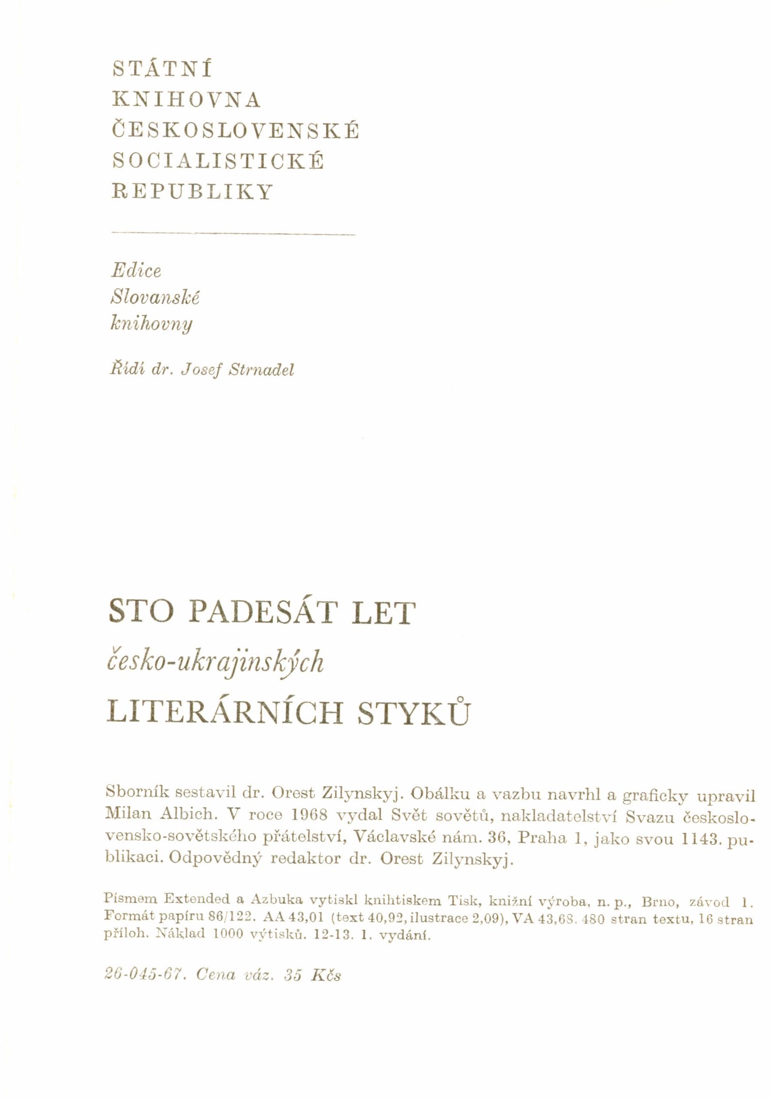 Title information Sto padesát let česko-ukrajinských literárních styků 1814-1964 : vědecko-bibliografický sborník = Sto pjatděsjat rokiv česko-ukrainskich literaturnich zvjazkiv 1814-1964: naukovo-bibliografičnij zbirnik / redakce sborníku a vedení biblografických prací Orest Zilynskij Další autoři Zilynskyj, Orest, 1923-1976 (Compiler) (Redactor) (Dedicator) Vladislav, Jan, 1923-2009 (Dedicatee) Corporation Svět sovětů (nakladatelství) (Publisher) Tisk Brno (tiskárna) (Printer) Publication Praha : Svět sovětů, 1968 Manufacture Brno : Tisk, knižní výroba, n.p., závod 1 Scope 477 stran, 8 listů obrazových příloh : fotografie, portréty, faksimile ; 21 cm ISBN (Vázáno) Edition Edice Slovanské knihovny, (Národní knihovna ČR - Slovanská knihovna)