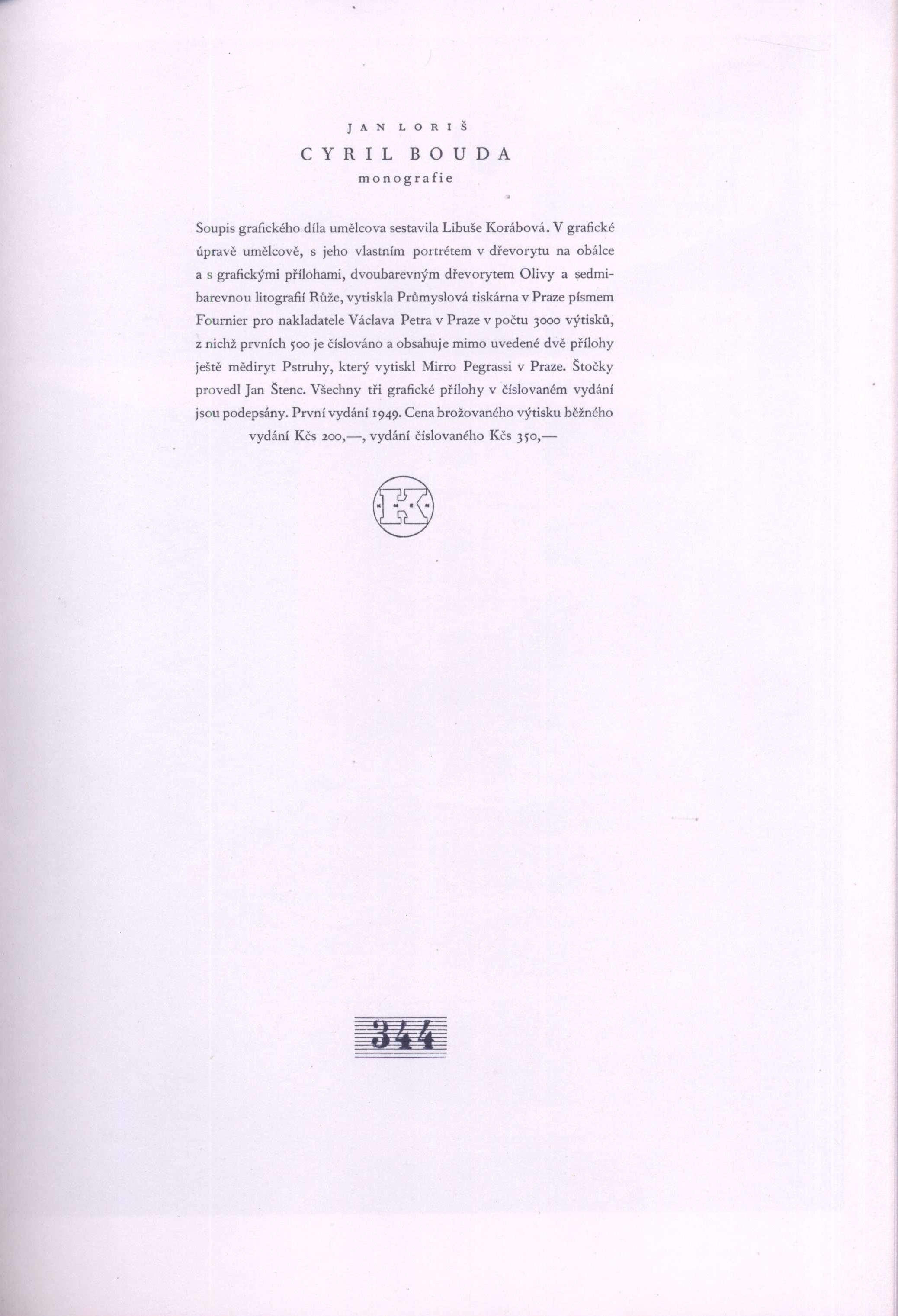 Cyril Bouda : monografie / Jan Loriš. -- První vydání. -- Praha : Václav Petr, 1949. -- V Praze : Průmyslová tiskárna. -- 73 stran, 64 nečíslovaných stran obrazové přílohy, 6 nečíslovaných listů barevné obrazové přílohy : ilustrace, grafiky, portréty ; 27 cm. -- Soupis grafického díla umělcova sestavila Libuše Korábová. -- V grafické úpravě umělcově, s jeho vlastním portrétem v dřevorytu na obálce a s grafickými přílohami, dvoubarevným dřevorytem a sedmibarevnou litografií. -- Mědiryt vytiskl Mirro Pegrassi. -- Všechny tři grafické přílohy v číslovaném vydání jsou podepsány. -- Vyšlo v nákladu 3000, z nichž prvních 500 je číslováno a obsahuje ještě mědiryt. -- Obsahuje bibliografii. -- ISBN : (Vázáno).