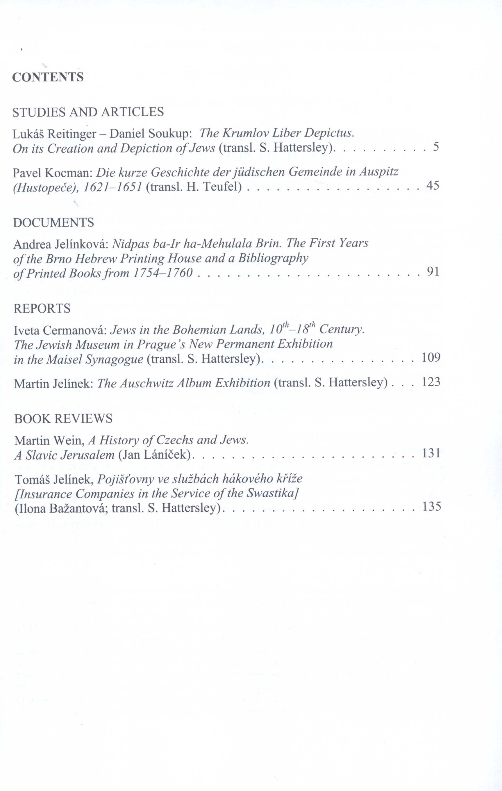 Title information Judaica Bohemiae Další autoři Cermanová, Iveta, 1976- (Editor) Putík, Alexandr, 1950- (Editor) Vašek, Vladimír, 1974- (Graphic technician) Hattersley, Stephen (Translator) Teufel, Helmut, 1944- (Translator) Corporation Židovské muzeum (Praha, Česko) (Publisher) Calamarus (tiskárna) (Printer) Roč., číslo 50/2, 2015 Publication Praha : Židovské muzeum v Praze, 2015 Manufacture Calamarus, s.r.o. Scope 140 stran : fotografie, faksimile, mapky ; 24 cm ISBN (Brožováno) ISSN 0022-5738 Country Czech Republic Language English * German Note Text anglicky a německy. - Čb. fotografie, faksimile a mapky.