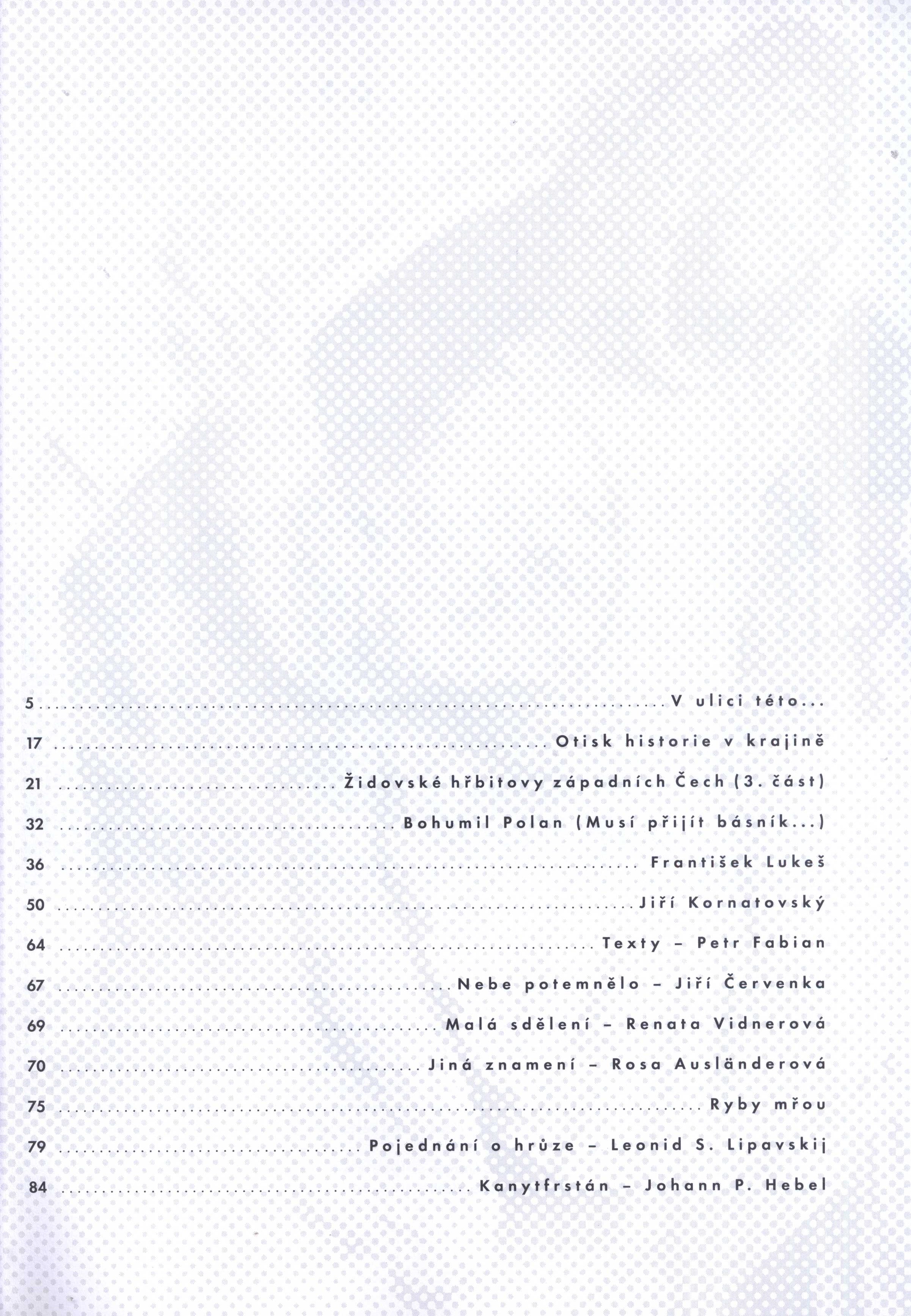 Poznámka o dalších původcích Redakce: Tomáš Hudec (šéfredaktor), Miroslav Anton, Peter Braun Redakční rada: Vratislav Färber, Marcel Fišer, Radovan Kodera, Vladimír Líbal, Václav Malina Document kind PERIODIKA - Přijatá čísla Periodicita neurčitelná periodicita Parent Pěší zóna Personal subjects Polan, Bohumil, 1887-1971 - knihovník, básník, esejista, kritik * Lukeš, František, 1943- - fotograf * Kornatovský, Jiří, 1952-2025 - malíř, kreslíř, grafik, ilustrátor a pedagog Keywords česká literatura * básně * kultura * výtvarné umění * archeologie * Plzeň * západní Čechy * židovské hřbitovy * r. 2000 * revue UDC (437.31-15) * 82-83 * 902 * 82-34 * 82-84 * 82-1 * 72/76 * 885.0-4 * 008(437.171) Uživatelské pole PNP Sign. Ac 131: 1 brožovaný svazek. - V jedněch deskách spolu s č. 8/2001 sg. Ac 132 a č. 12-13/2003 sg. Ac 133. Call number Track No. Location Info Ac 0131 0958/2020 Sbírka