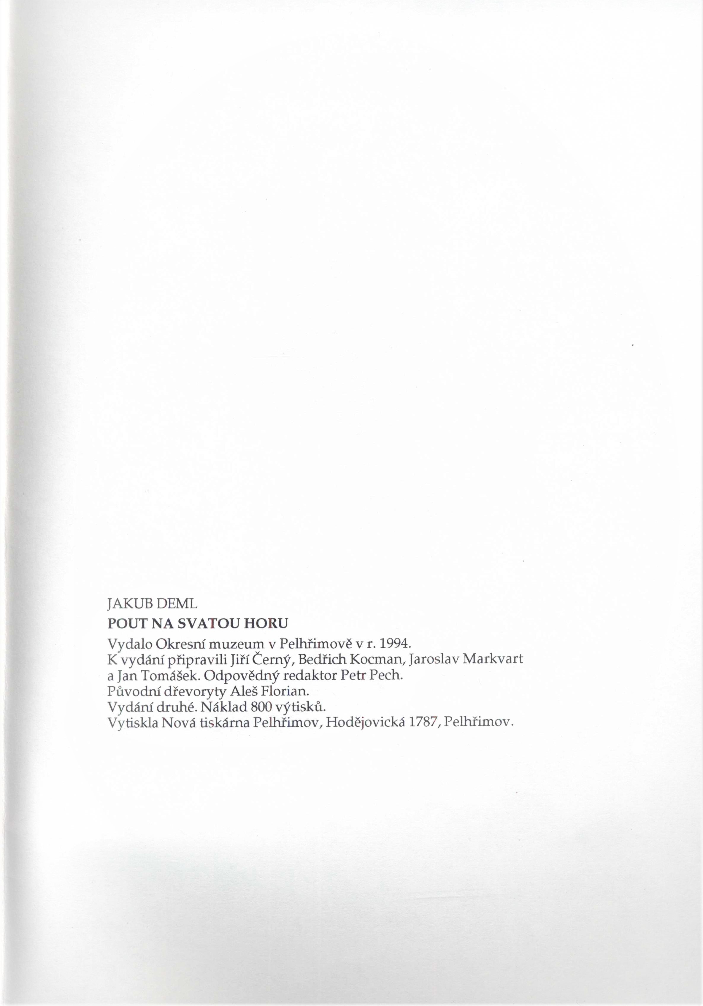 Title information Pout na Svatou Horu / Jakub Deml ; k vydání připravili Jiří Černý, Bedřich Kocman, Jaroslav Markvart a Jan Tomášek ; původní dřevoryty Aleš Florian Personal name Deml, Jakub, 1878-1961 (Author) Další autoři Černý, Jiří, 1961 říjen 13.- (Editor) Kocman, Bedřich, 1952- (Editor) Markvart, Jaroslav (Editor) Tomášek, Jan, 1949- (Editor) Florian, Aleš (Illustrator) Corporation Nová tiskárna Pelhřimov (tiskárna) (Printer) Okresní muzeum (Pelhřimov, Česko) (Publisher) Edition statement Vydání druhé Publication Pelhřimov : Okresní muzeum, 1994 Manufacture Nová tiskárna Pelhřimov Scope 67 stran : ilustrace ; 29 cm ISBN 80-239-7440-8 (v knize neuvedeno ; brožováno) Country Czech Republic Language Czech Note Dřevoryt na obálce. - Černobílé dřevoryty v textu. - 800 výtisků.