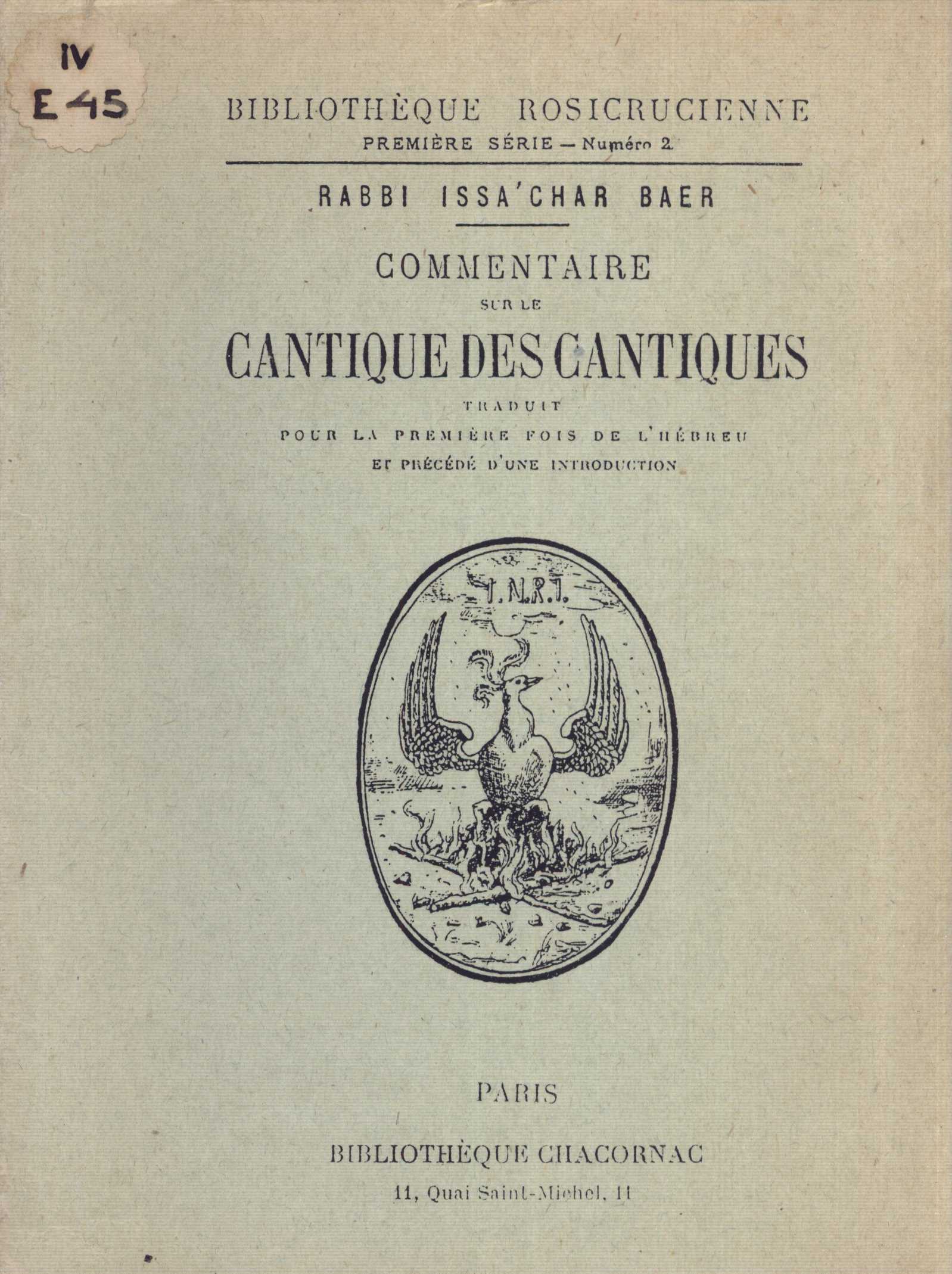 Title information Commentaire sur le Cantique des cantiques traduit pour la première fois de l'hébreu et précédé d'une introduction / Rabbi Issa'char Baer Personal name Issakar Bär ben Mosé Petahiah (Author) Publication Paris : Bibliothèque Chacornac, 1897 Scope 54 stran ISBN (brožováno) Edition Bibliothèque rosicrucienne (Bibliothèque Chacornac) No 2