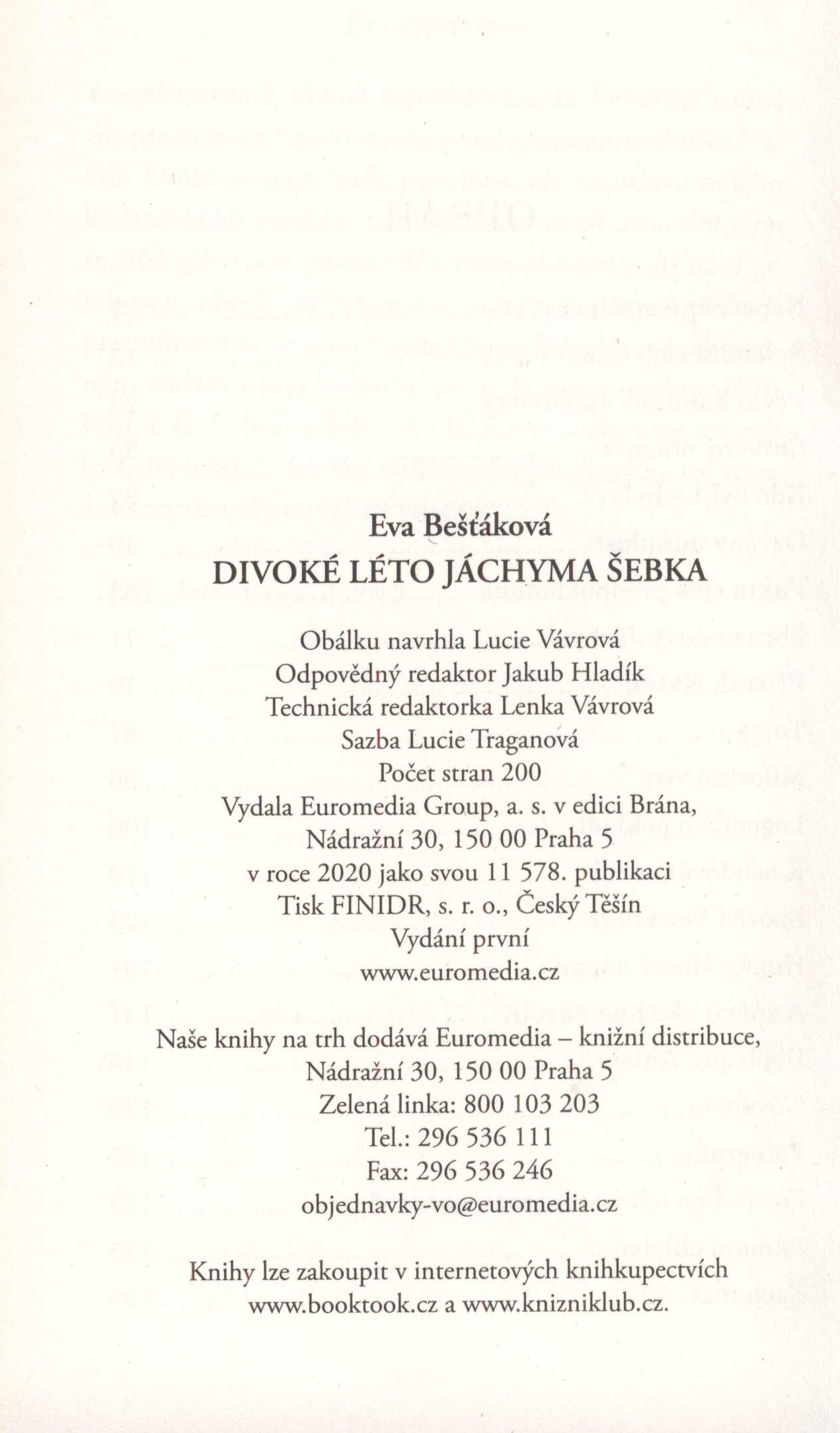 Title information Divoké léto Jáchyma Šebka / Eva Bešťáková ; obálku navrhla Lucie Vávrová Personal name Bešťáková, Eva, 1932-2021 (Author) Další autoři Vávrová, Lucie (Bookjacket designer) Corporation Euromedia Group, a. s. - Brána (nakladatelství) (Publisher) Finidr (tiskárna) (Printer) Edition statement Vydání první Publication Praha : Euromedia Group, 2020 Manufacture Český Těšín : FINIDR, s.r.o. Scope 198 stran ; 21 cm ISBN 978-80-242-6808-8 (vázáno) Country Czech Republic Language Czech Note Zdobená barevná obálka. - Na zadní straně obálky anotace a bio-bibliografická poznámka o autorce.