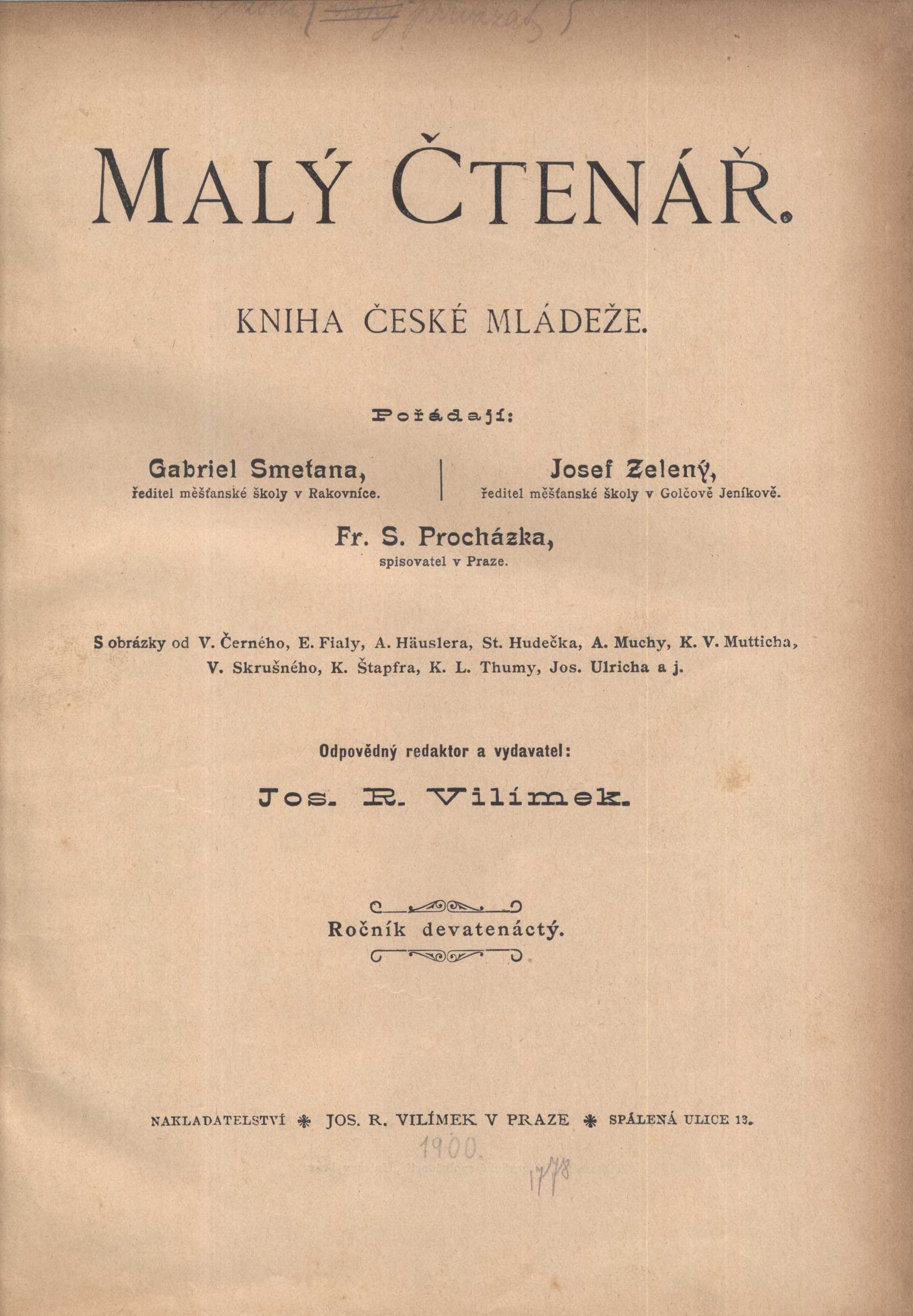 Title information Malý čtenář : kniha české mládeže Další autoři Smetana, Gabriel, 1855-1933 (Compiler) Zelený, Josef A., 1851- (Compiler) Procházka, František Serafínský, 1861-1939 (Compiler) Vilímek, Josef Richard, 1835-1911 (Publishing director) (Publisher) Corporation Jos. R. Vilímek (nakladatelství) (Publisher) Unie (tiskárna) (Printer) Roč., číslo Ročník 19, číslo 1-20, 1899/1900 Publication Praha : Nakladatelství Jos. R. Vilímka, 1899-1900 Manufacture Tiskem České grafické společnosti "Unie" Scope 316 stran : ilustrace ; 24 cm ISSN 1802-6885 Country Czech Republic Language Czech Note Většina obálek se stejným motivem. - Čb. ilustrace v textu i celostránkové. - V příloze barevná celostránková ilustrace: Obrázek St. Hudečka k pohádce "Zlatá struna"